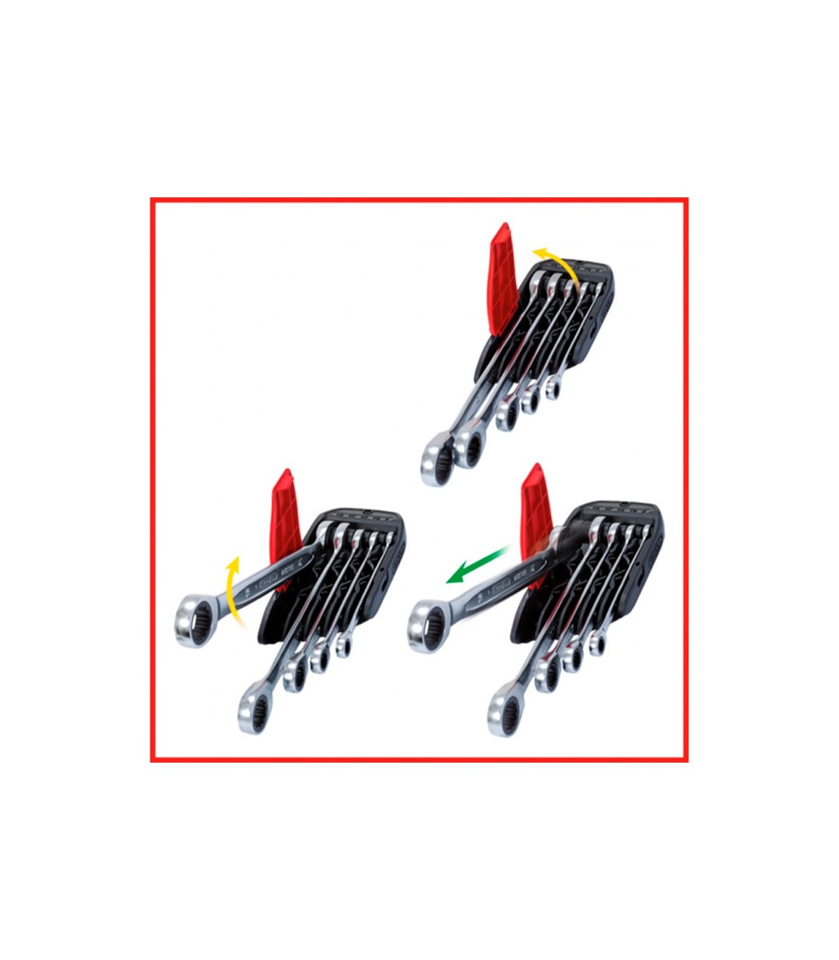 Juego compacto de 5 llaves mixtas/ combinadas, con boca fija y cerrada con trinquete Gear-Plus. Contiene las llaves más comunes en mecánica general.
