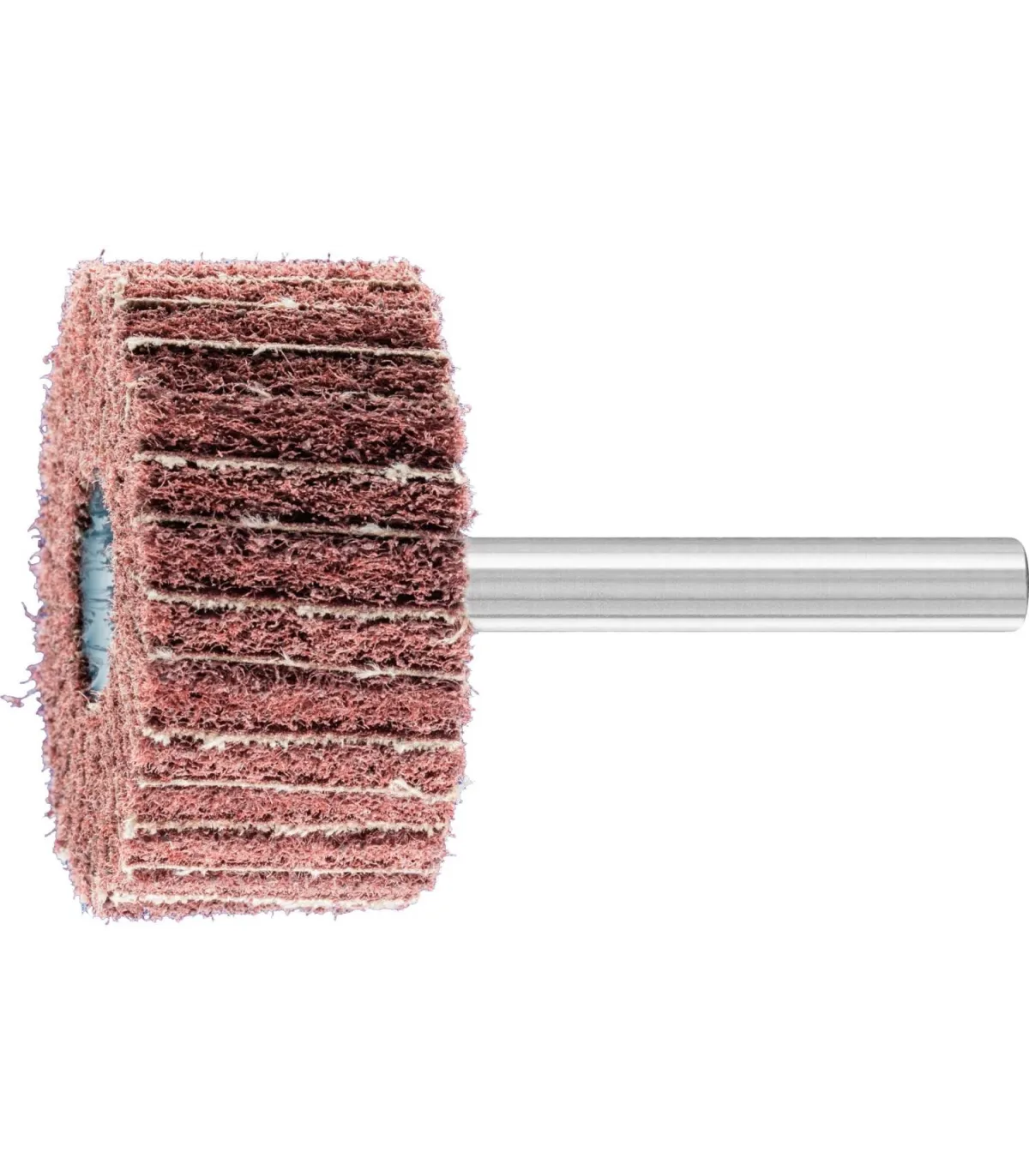 Láminas de vellón dispuestas radialmente e intercaladas con láminas de lija. Esto garantiza un mayor arranque de material y la superficie adquiere, al mismo tiempo, un aspecto más basto. Abrasivo: Corindón A.