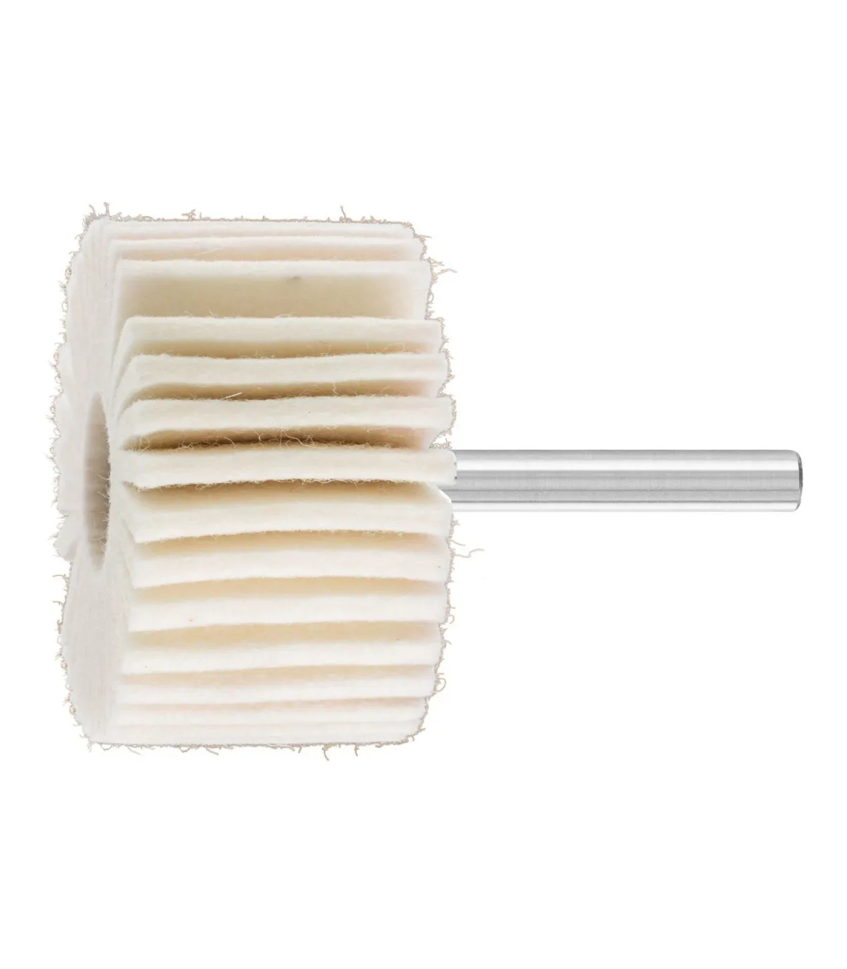 Los abanicos de fieltro se utilizan junto con las pastas de pulir desde el prepulido hasta el pulido espejo en piezas pequeñas y medianas. Su estructura de láminas hace que sea una herramienta de pulido muy adecuada para trabajar los contornos de la pieza de trabajo.