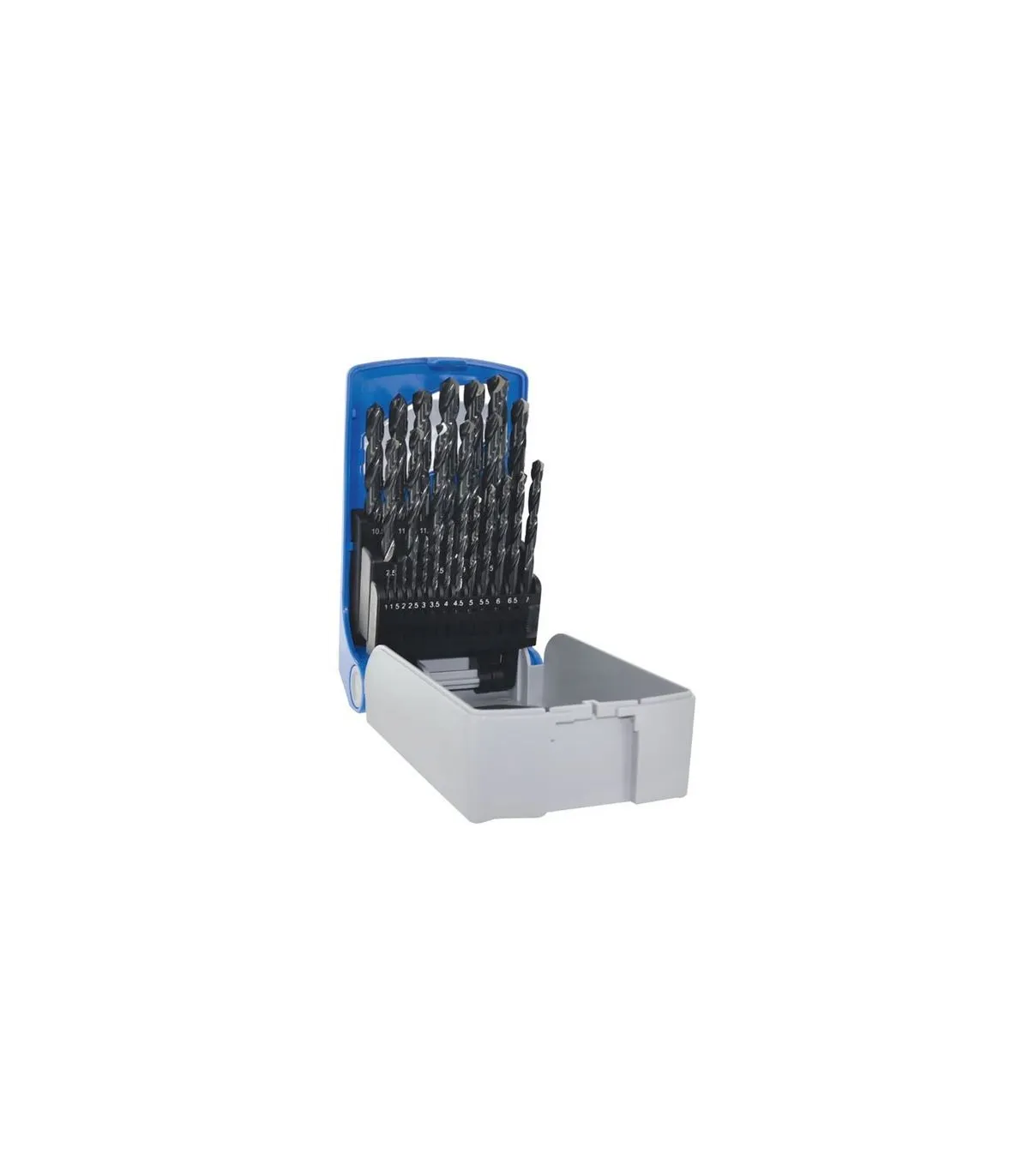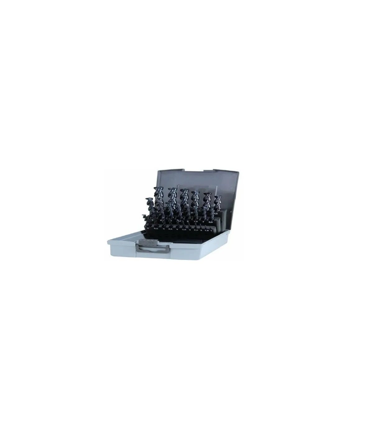 Completo juego de 25 brocas en acero rápido HSS, con punta y filo rectificado, acabado fosfatado negro, desde Ø 1,00 a 13,00mm, cada 0,50mm. Fabricación europea.