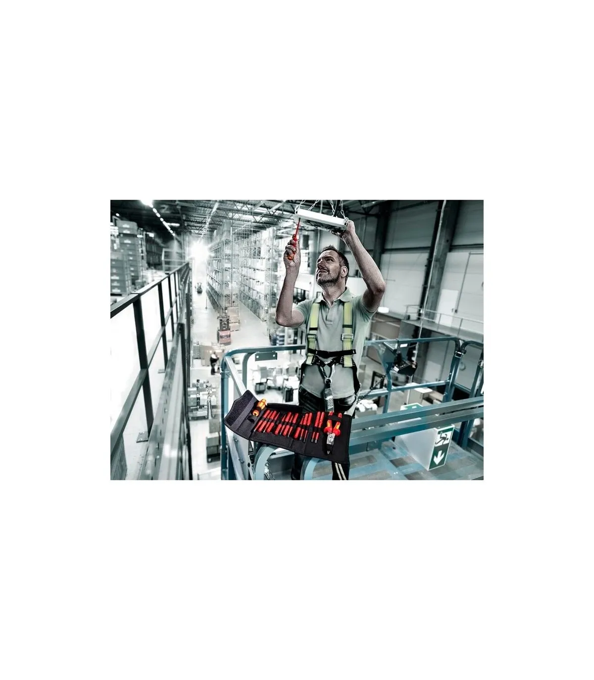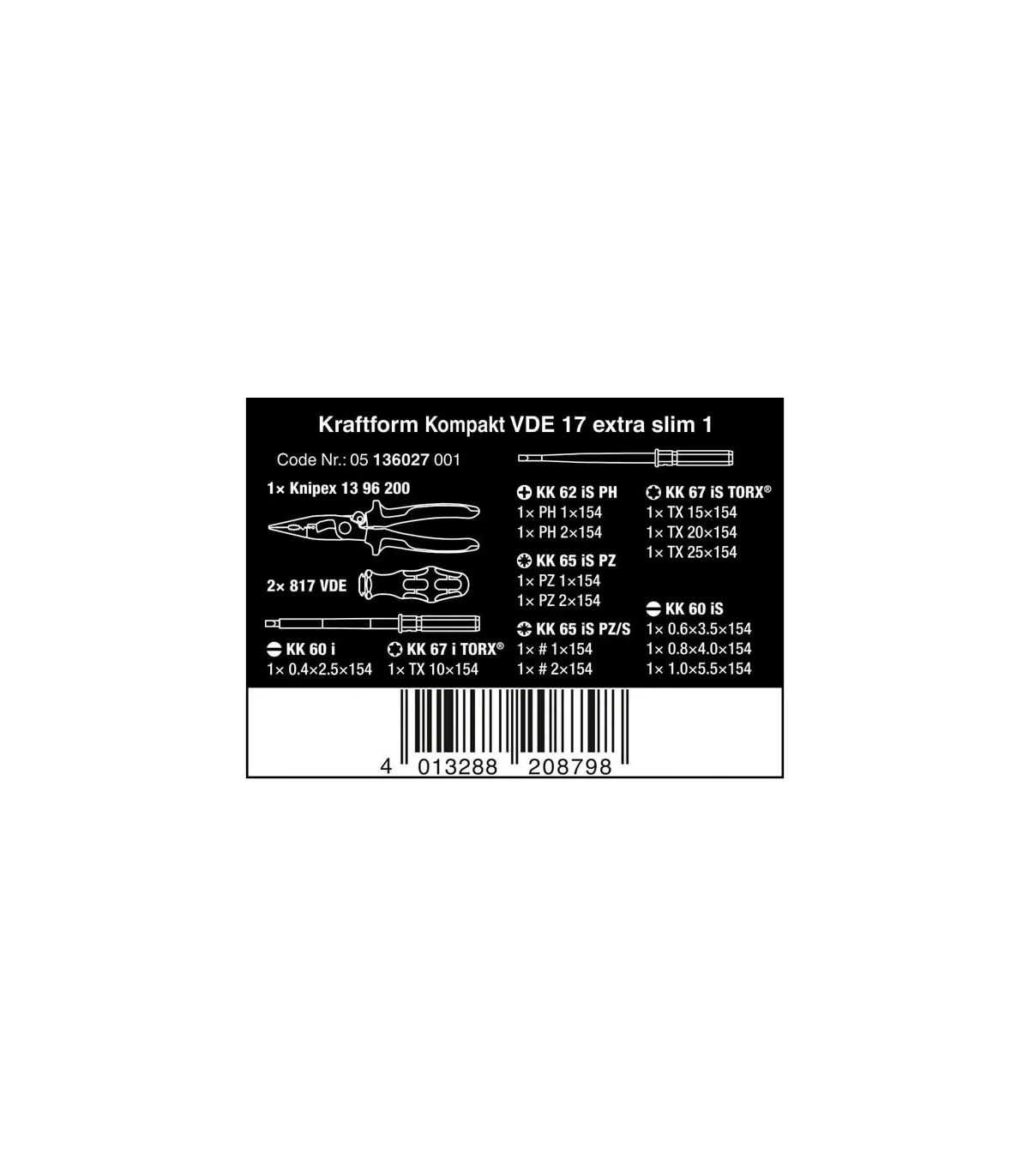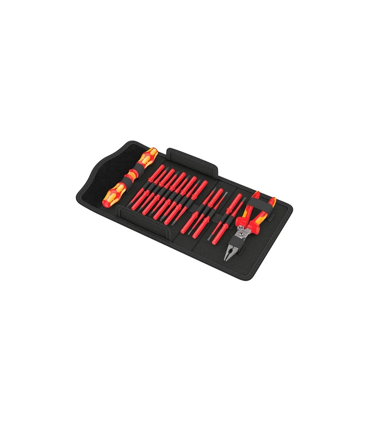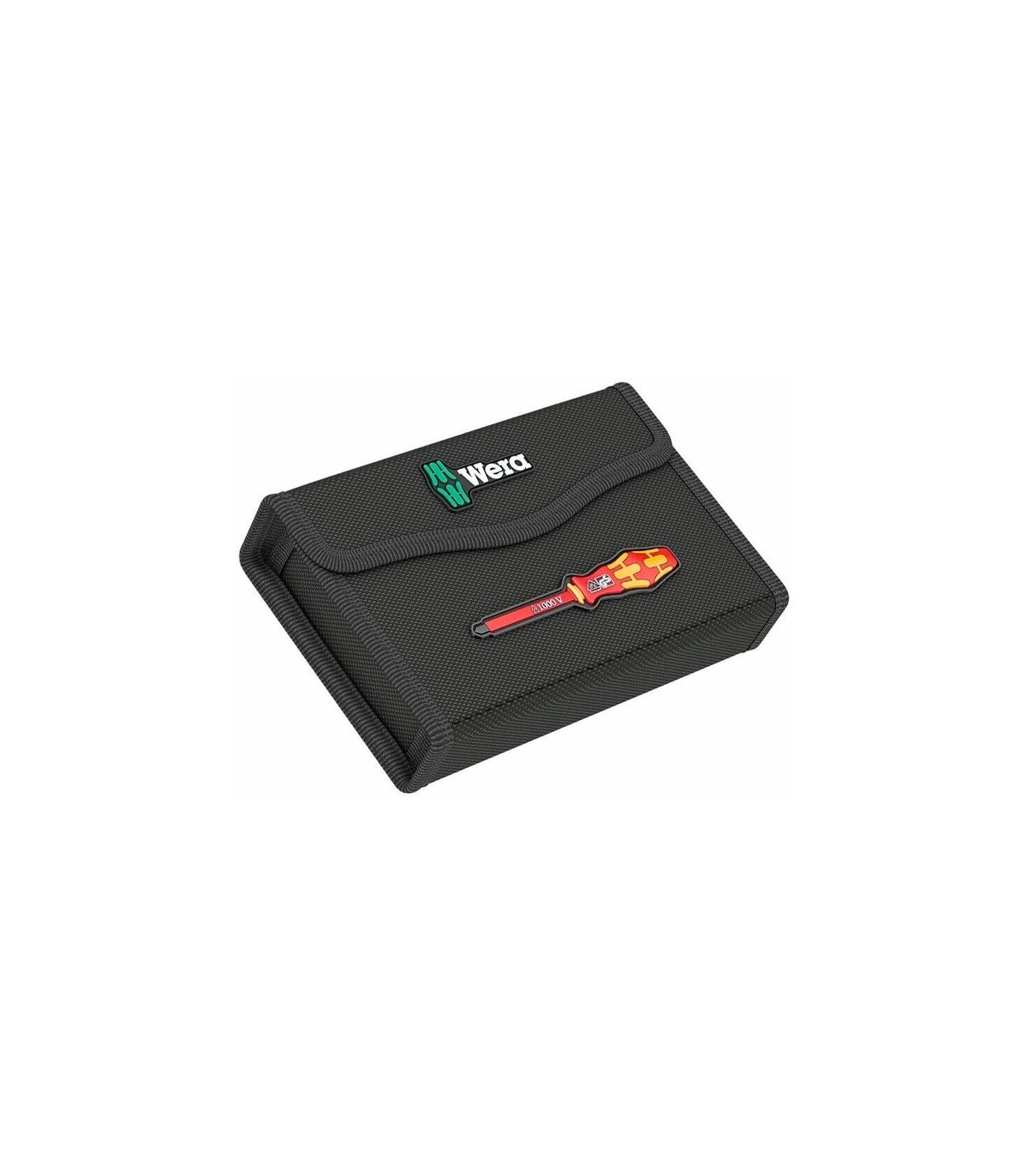 Completo juego de 14 varillas intercambiables VDE (cada una de 154 mm) con diámetro de varilla reducido (artículo KK 60 i 0,4x2,5 y KK 67 i TX 10 diámetro estándar de varillas) para que sea posible acceder a elementos de uniones atornilladas y elementos de muelles que se encuentran a mayor profundidad y poder realizar los trabajos correspondientes. 2 mangos portavarillas 817 VDE para varillas intercambiables VDE de Wera; un mango tipo Kraftform para un trabajo ergonómico; en un estuche robusto para el cinturón. Herramientas probadas una por una en un 100 % según la norma IEC 60900 a 10.000 voltios para garantizar un trabajo seguro a la tensión permitida de 1.000 voltios. 1 alicate Knipex para instalaciones eléctricas VDE 13 96 200; la alicate sustituye hasta 6 herramientas individuales para instalaciones eléctricas: cortar, aislar, agarrar, torcer, desbarbar y crimpear - todo con una sola herramienta. Con un trinquete de bloqueo para lograr un agarre más suave. El cromado proporciona una mayor protección anticorrosiva; las envolturas multicomponentes del mango están aisladas.