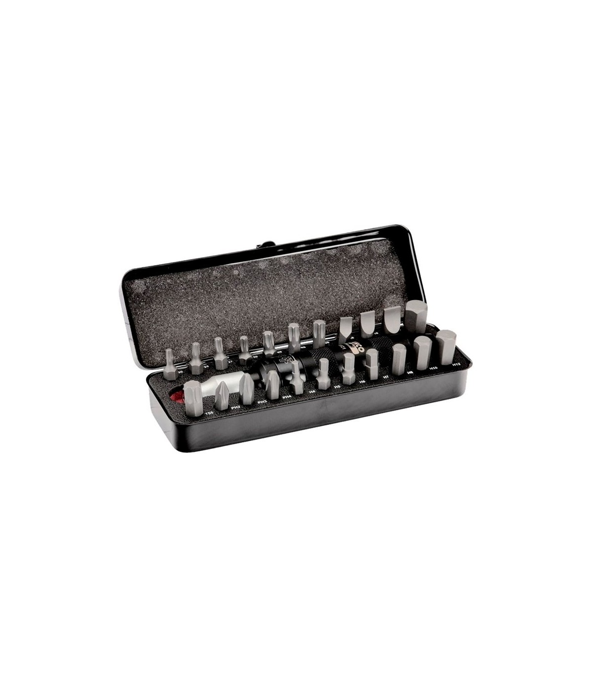 Juego de puntas de 23 piezas: 21 puntas, 1 destornillador a golpe y 1 adaptador para portapuntas.