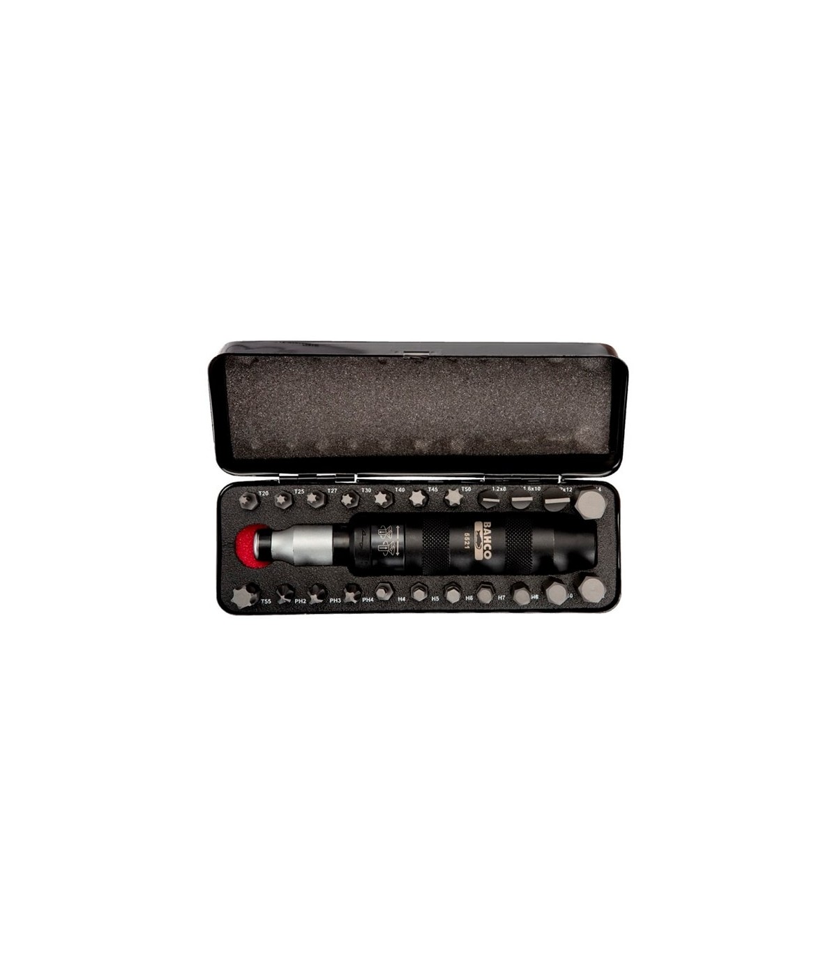 Completo juego de destornillador de golpeo con 23 destorpuntas, planas, estrella, hexagonales y torx, marca BAHCO, máxima calidad para el profesional más exigente.