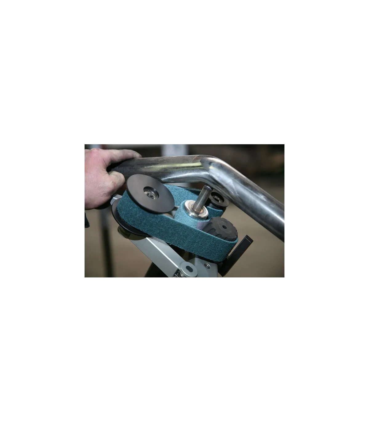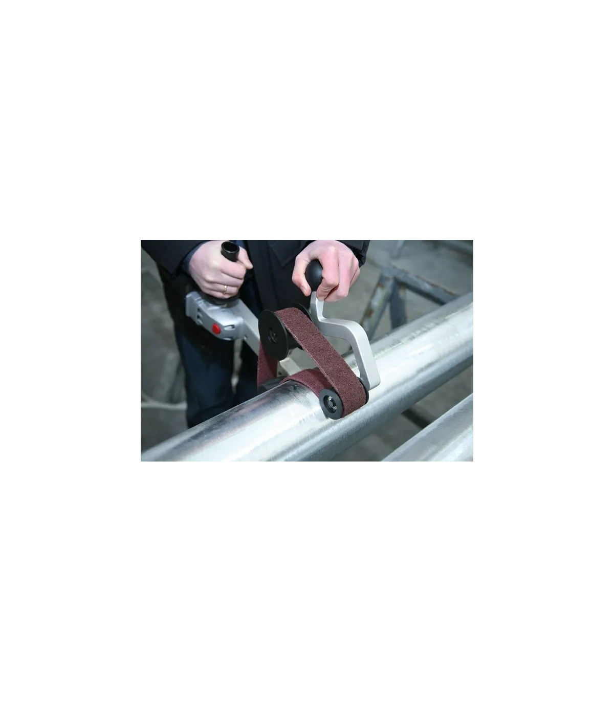 Las 3 ruedas guía del nuevo Finitube llaman inmediatamente la atención. Cada rueda tiene su propio diseño y propiedades técnicas. Cada banda de rodadura tiene su propio patrón. Las dos ruedas correderas son resistentes al desgaste y a la rotura y están equipadas con pestañas laterales especialmente diseñadas. El volante de goma viene con ranuras en V inteligentes. Este concepto único le da al usuario muchas ventajas. En primer lugar, está el seguimiento de la correa increíblemente flexible y estable. Las innovadoras ruedas guía hacen prácticamente imposible que la cinta abrasiva de la máquina se deslice, independientemente de la posición de la máquina o del usuario o de la complejidad del tubo a trabajar. Las ranuras en V garantizan una tracción perfecta sin deslizamiento y un funcionamiento fresco que prolonga considerablemente la vida útil de sus bandas abrasivas.