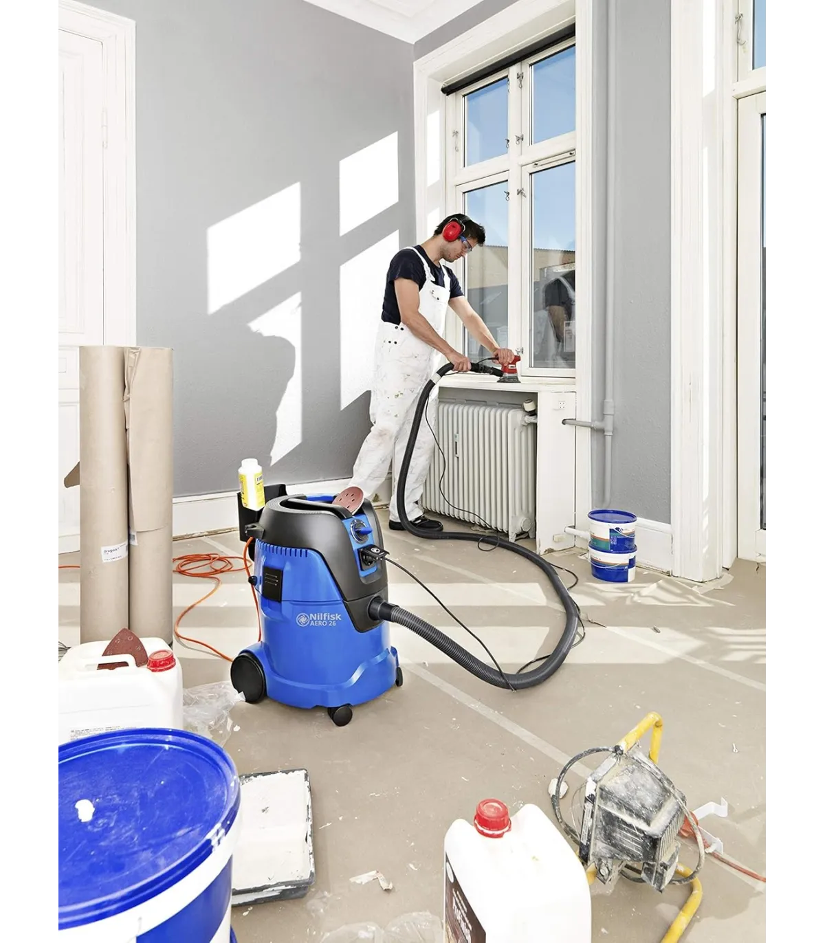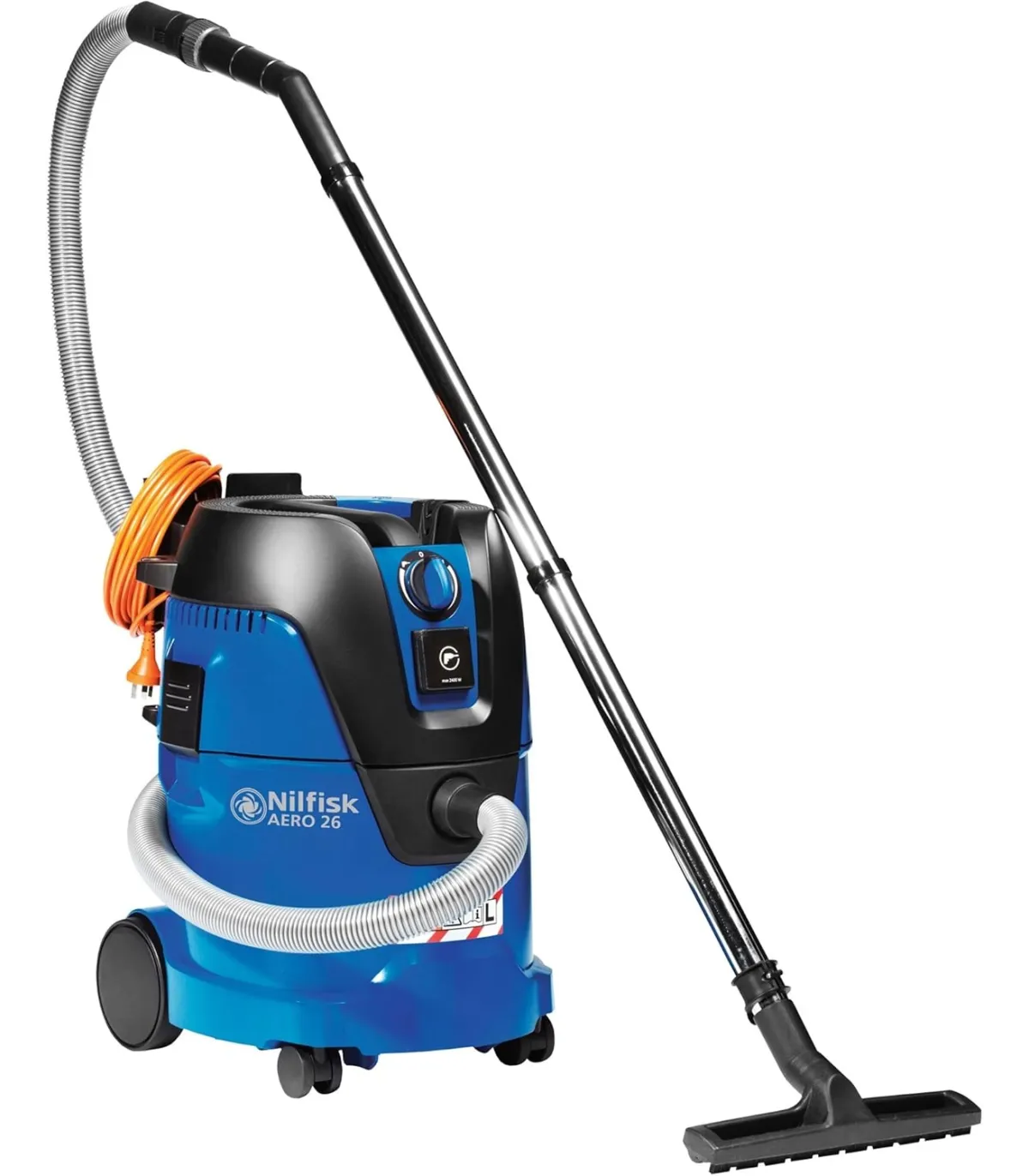 AERO 26 es una máquina con alto enfoque en las aplicaciones y necesidades del usuario final. Caracterizado por el Push&Clean, sistema de limpieza del filtro y función de soplado de aire, se encuentra en todos los modelos junto con el almacenamiento de accesorios flexible y conveniente. La máquina de 25 litros tiene la potencia de succión eficiente y está disponible con sistema de enrrollado de cable opcional.