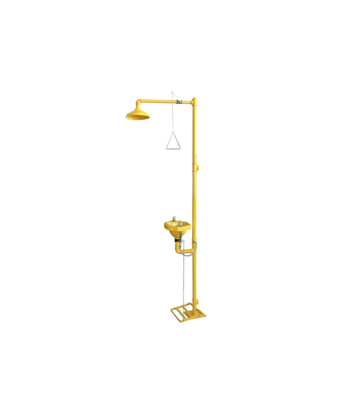 La ducha se activa mediante una barra de tracción y el lavaojos se activa a través de la manilla o pedal de pie.