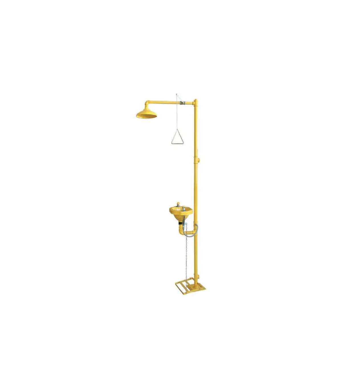 Construida tubería en acero galvanizado y pintado amarillo, válvula en latón, pileta en ABS y activación en acero inoxidable..