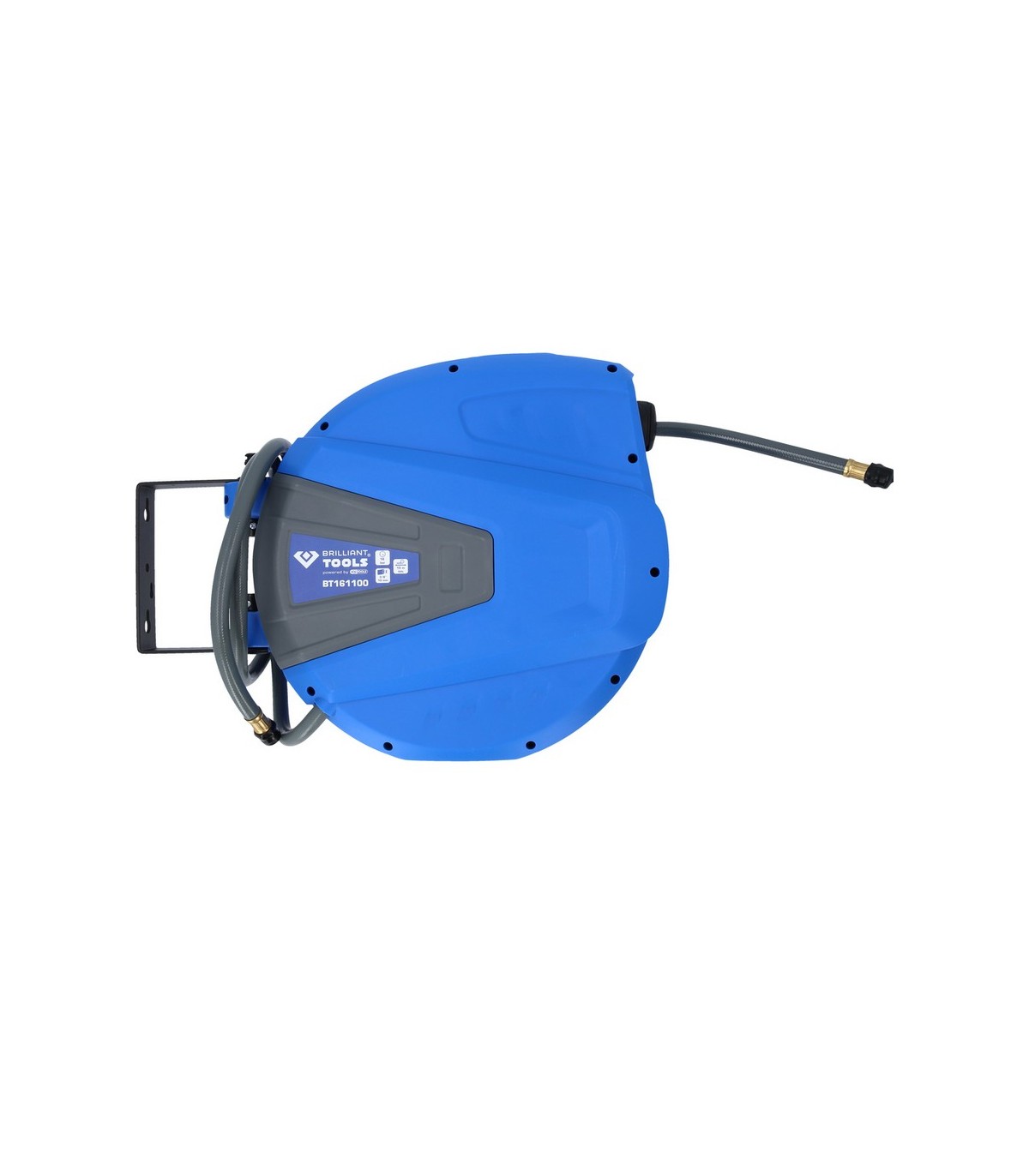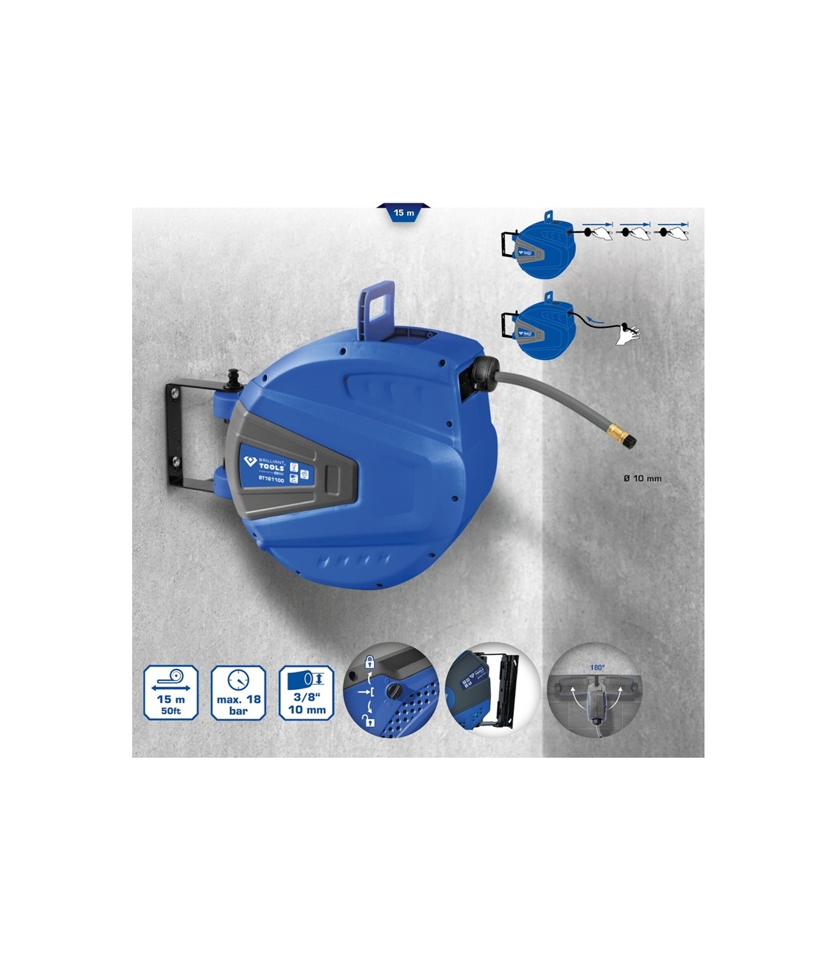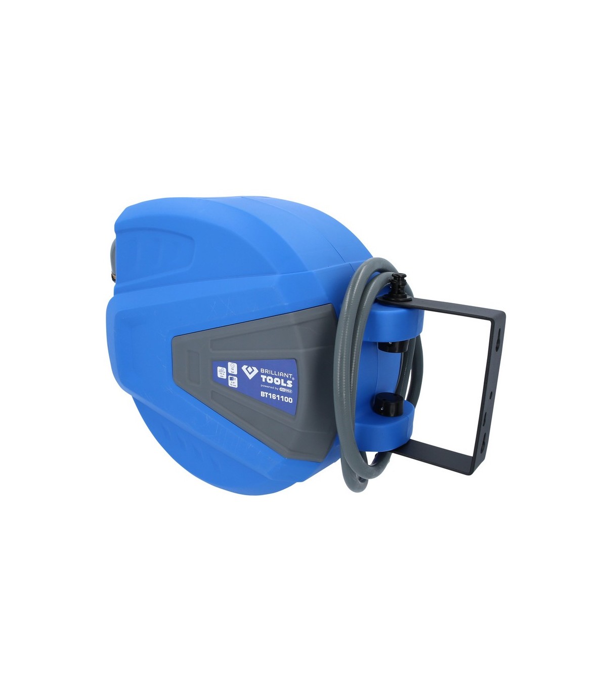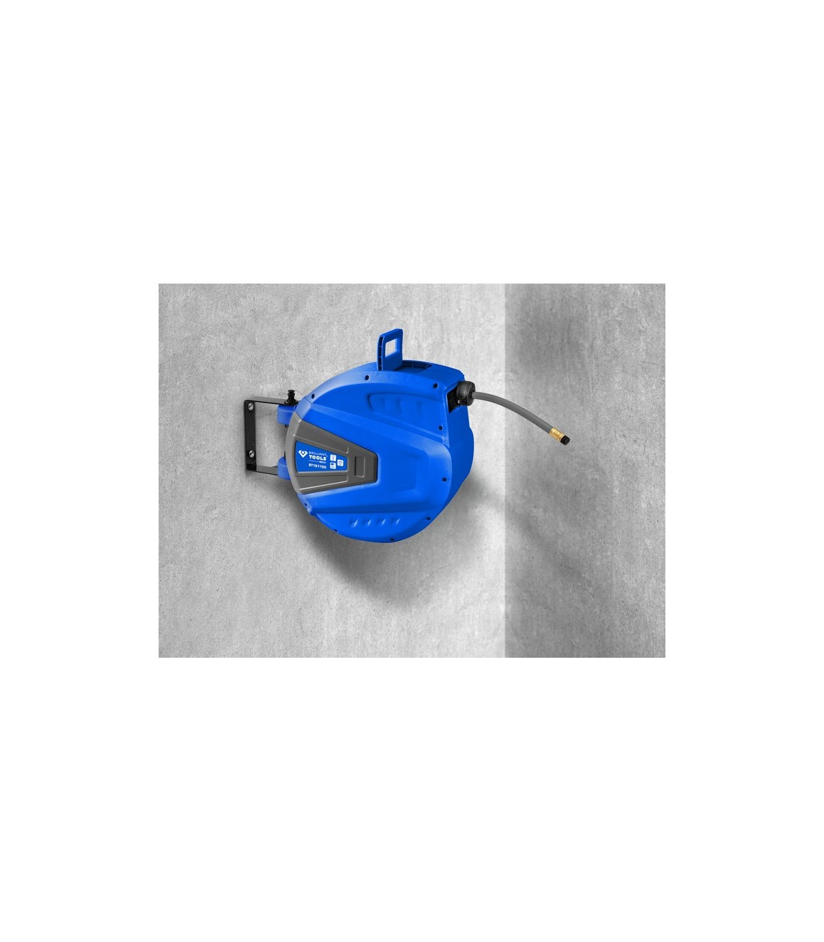 El enrollador de manguera automático, con su carcasa de plástico resistente a los impactos, está equipado con un soporte de montaje giratorio para su montaje en pared o techo.