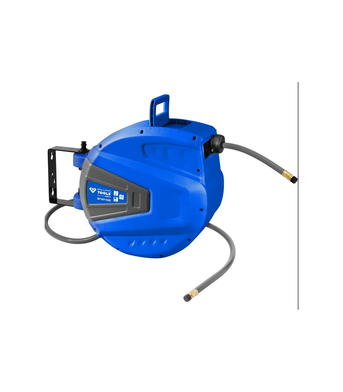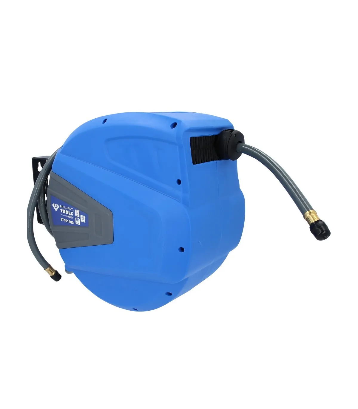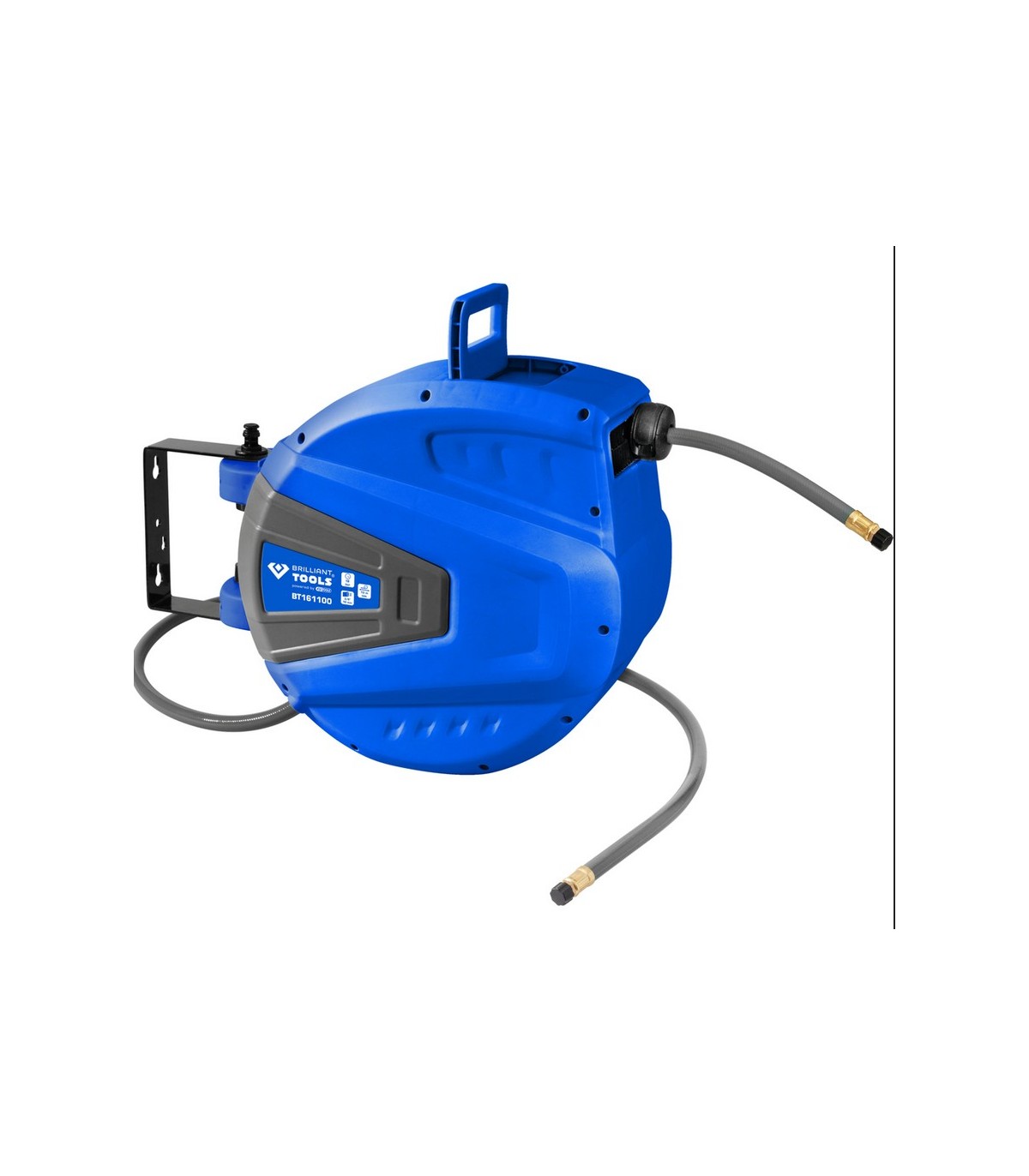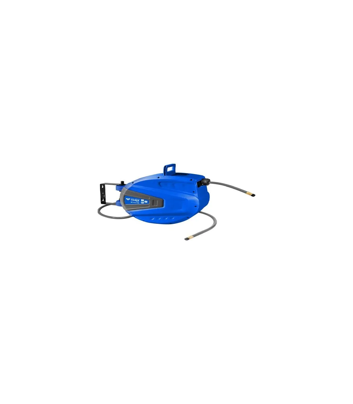 El enrollador de manguera automático, con su carcasa de plástico resistente a los impactos, está equipado con un soporte de montaje giratorio para su montaje en pared o techo.