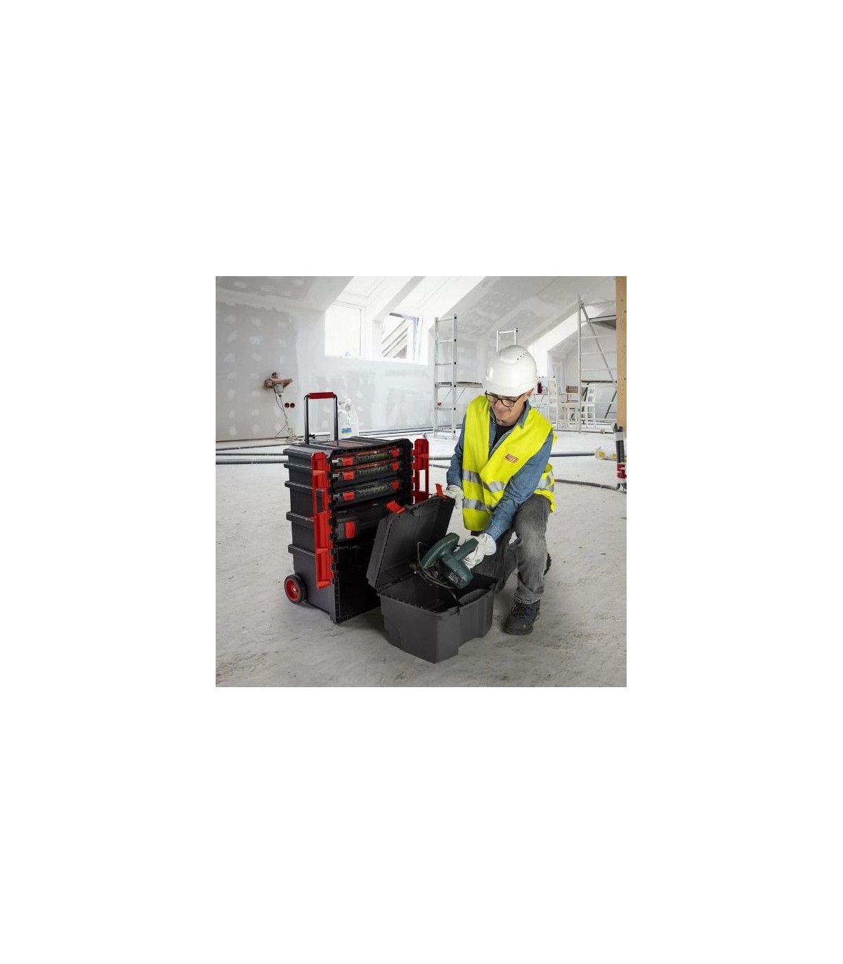 También incluye ruedas para facilitar su transporte y movilidad, lo que la hace ideal para su uso en talleres, obras de construcción y otros entornos de trabajo.