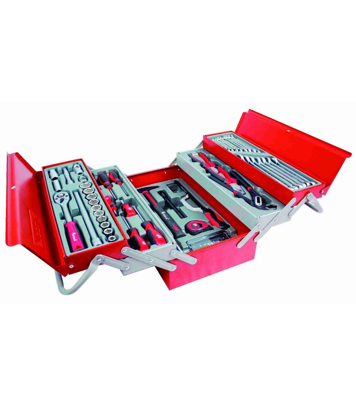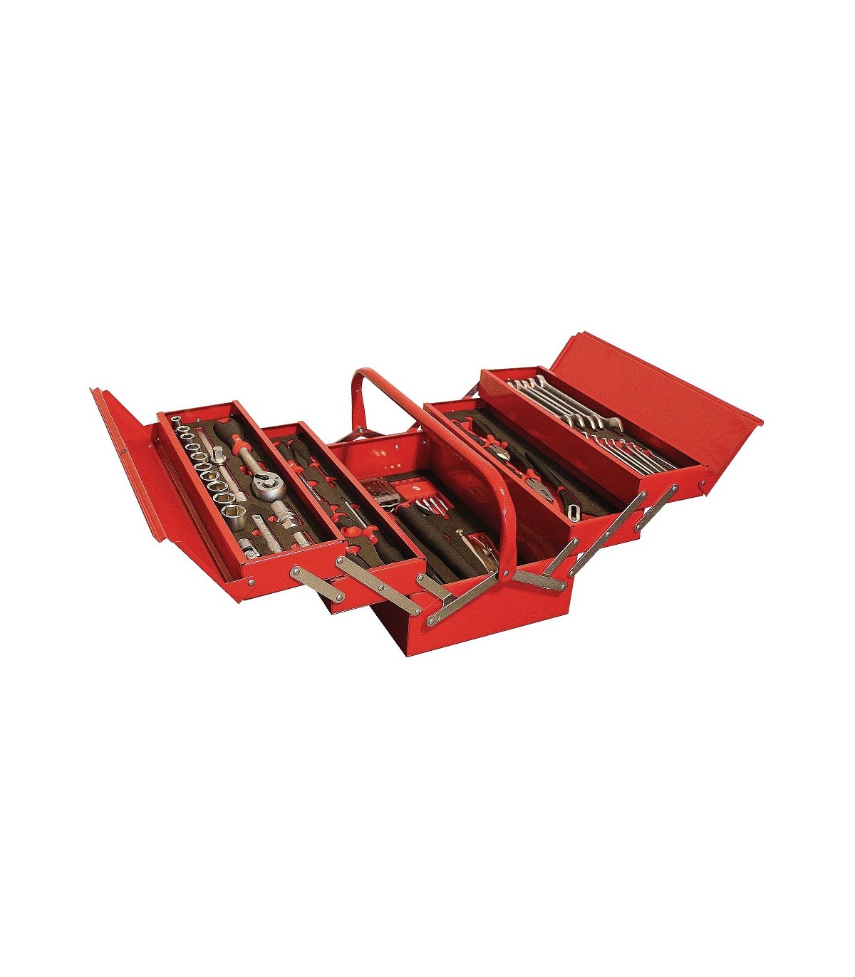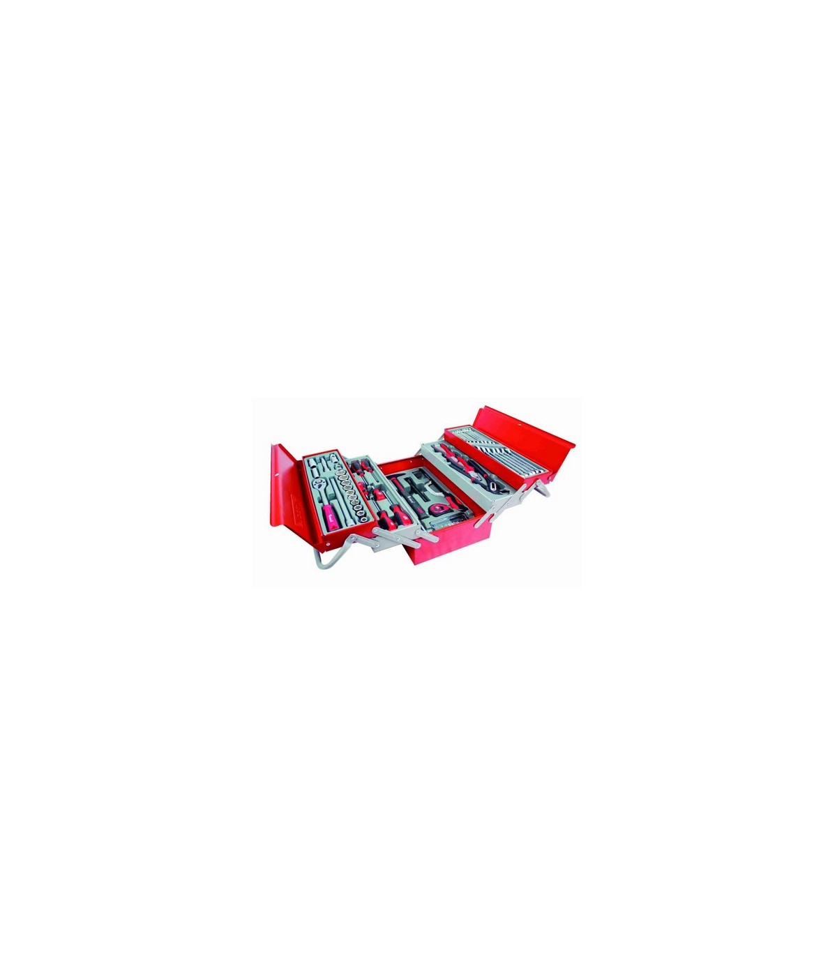 Un práctico y cómodo maletín metálico con bandejas que se despliegan hacia los laterales, ofreciéndote una gran variedad de instrumentos indispensables para cualquier asistencia mecánica.