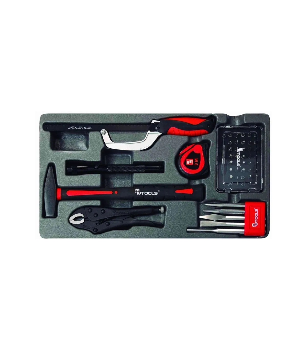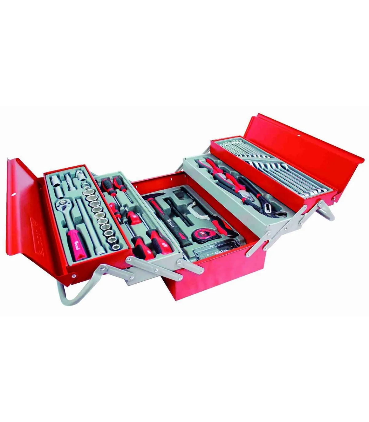 El kit incluye llaves de vaso, llaves de bujía, llaves de carraca, alargaderas, adaptadores, llaves combinadas, juegos de puntas, adaptadores magnéticos, alicates, alicates de corte, tenazas pico de loro, tenazas grip, destornilladores, martillos, fluxómetro y serrucho. Con esta completa colección, estará equipado para enfrentar cualquier proyecto.