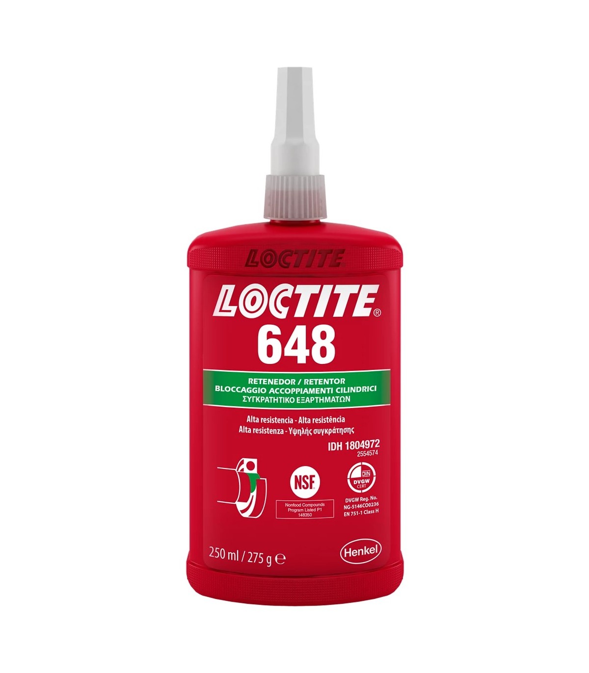 LOCTITE 648 es un compuesto retenedor anaeróbico acrílico de metacrilato de uretano, de color verde, fluorescente, de baja viscosidad y alta resistencia, diseñado para la unión de componentes cilíndricos ajustados. Evita el aflojamiento y las fugas a causa de impactos y vibraciones. Utilizado habitualmente para la sujeción de engranajes y ruedas dentadas a ejes de transmisión y rotores en ejes de motores eléctricos. Proporciona un sólido rendimiento de curado.Recomendado para la unión permanente de piezas cilíndricas que no requieren de desmontaje.Por ejemplo en retención de ejes de transmisión montaje de chavetas, y fijación de cojinetes, sistemas de transmisión, rodamientos, bujes, ejes.Ofrece alta resistencia en todos los metales, incluidos sustratos pasivos (por ejemplo, acero inoxidable).Ideal para la retención de montajes con holgura o interferencia.Homologación DVGW (EN 751-1): NG 5146C00236P1 NSF Reg. n.º: 148350Homologación WRAS (BS 6920): 0808532