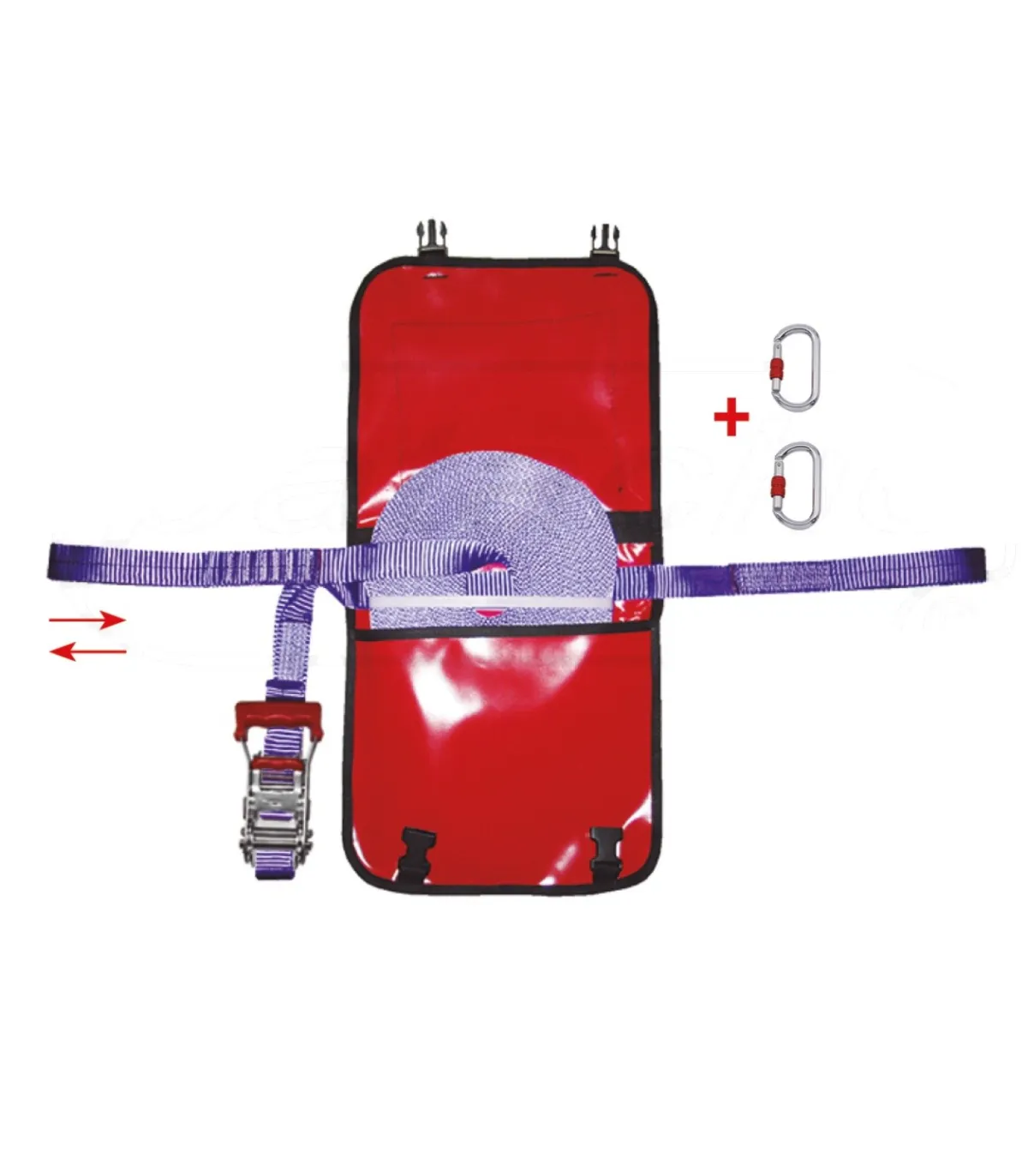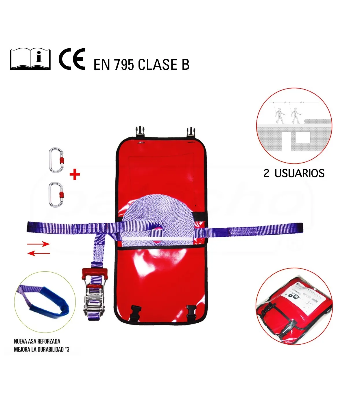 Línea de seguridad portátil en cinta de poliéster de alta tenacidad, (PARA 2 USUARIOS) ancho de la cinta 35 mm, incorpora refuerzos de asa en cada lateral, para una mayor durabilidad, reduciendo el desgaste de un uso prolongado y aumentando su vida útil.