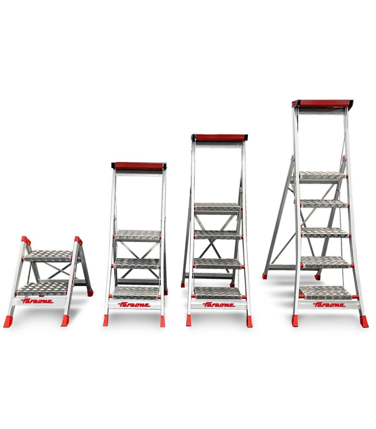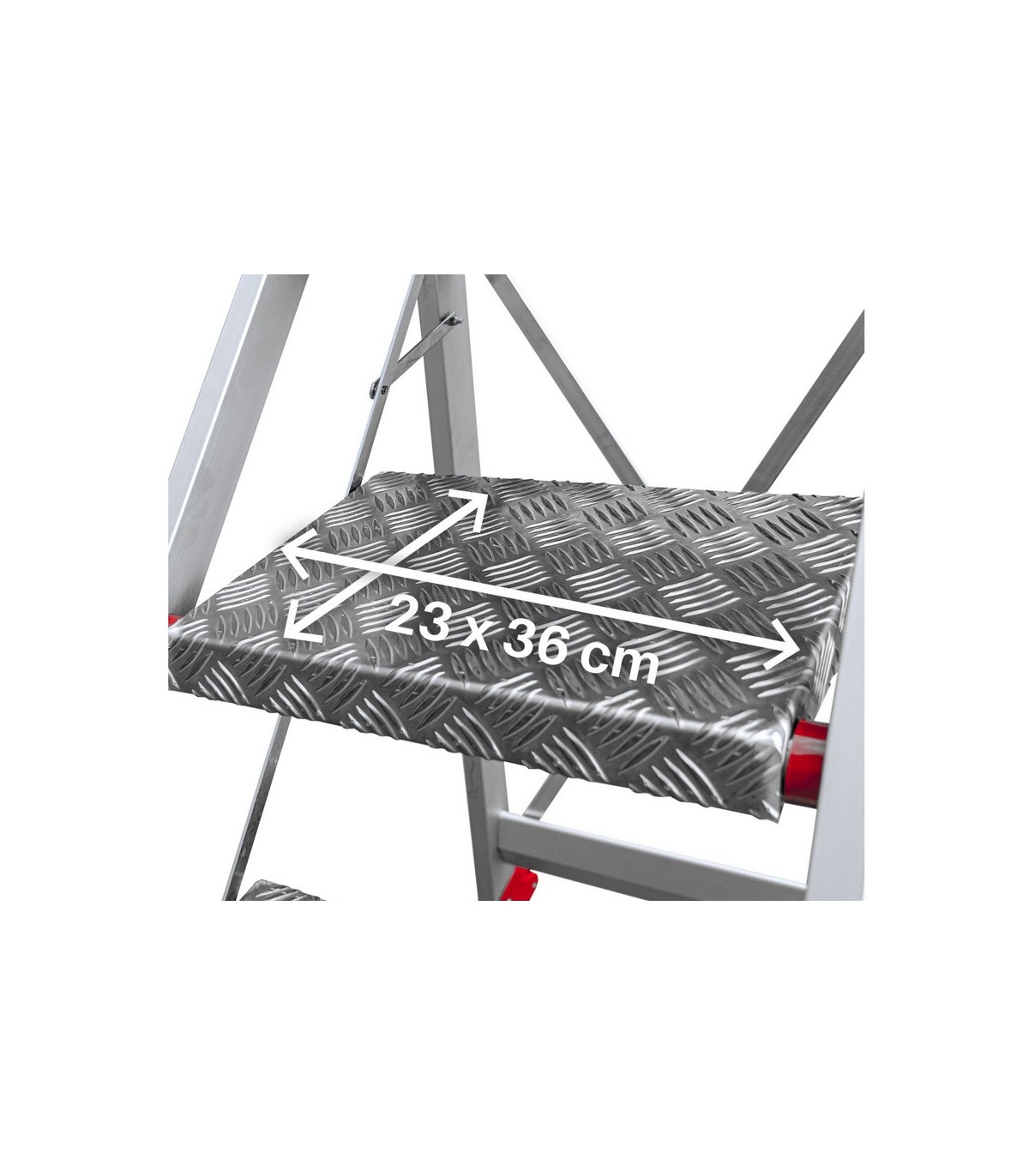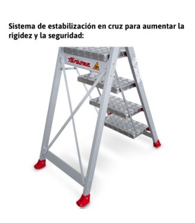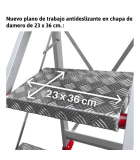 El modelo SGP es un taburete de aluminio con un plano de trabajo en chapa de damero y peldaños cómodos y seguros de 23x36 cm.