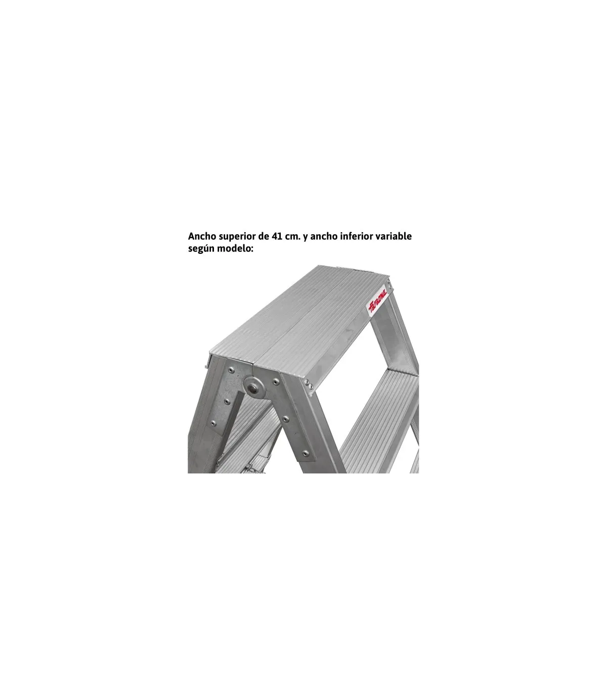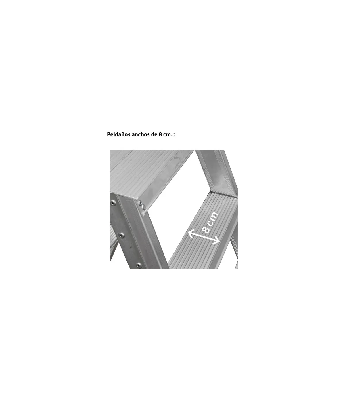 El modelo NDS está fabricado en aluminio, posee un sistema de bisagras rígido y resistente entre los dos tramos de subida, un sistema anti cierre seguro, peldaños de 13 cm y amplios tacos de goma con un buen agarre a la superficie.
