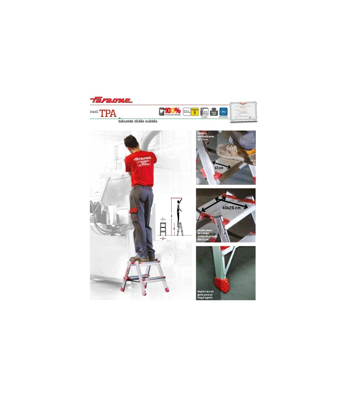 El modelo TPAS está fabricado en aluminio, posee un sistema de bisagras rígido y resistente entre los dos tramos de subida, un sistema anti cierre seguro, peldaños de 8 cm y amplios tacos de goma con un buen agarre a la superficie.