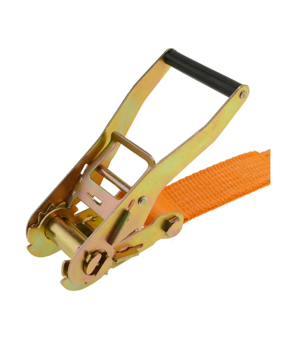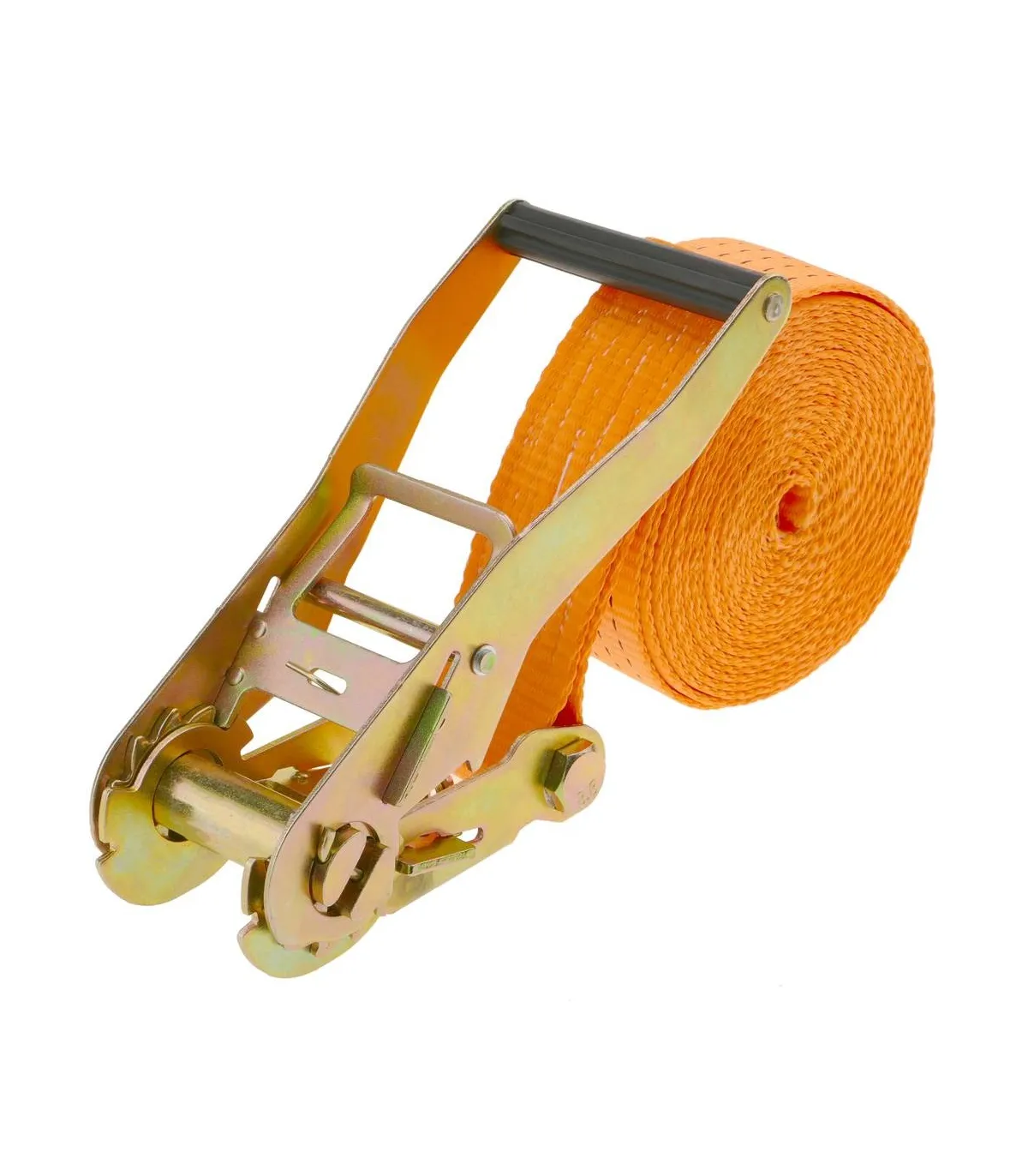 Amarre de cargas 5000KG-10M-SF, cierre carraca con cinta sin fin, con asa ergonómica plastificada en color rojo, ancho 50 mm, color naranja, largo 18 metros.