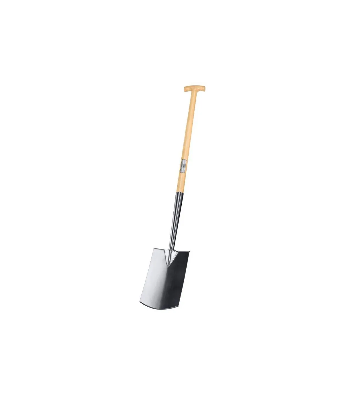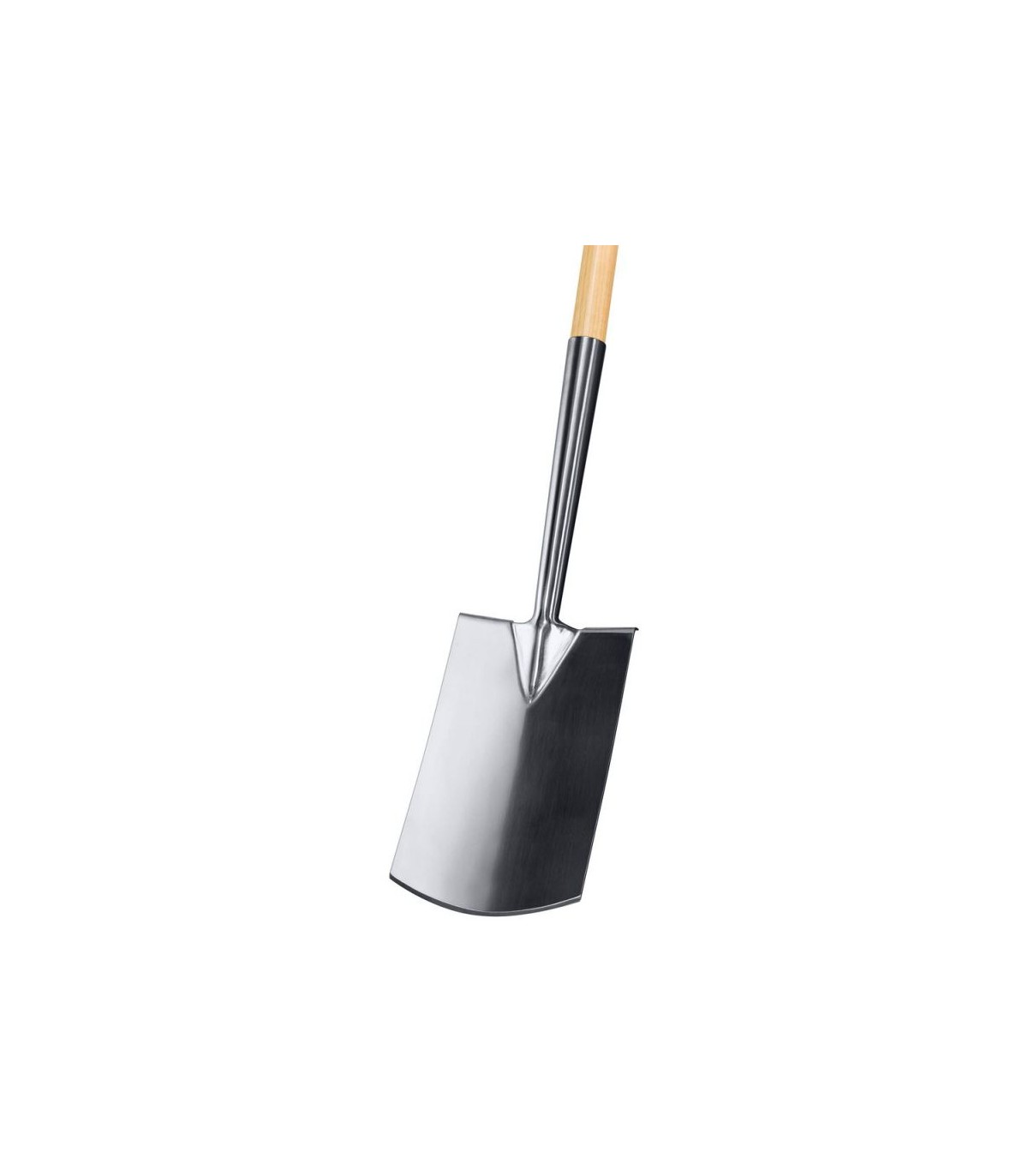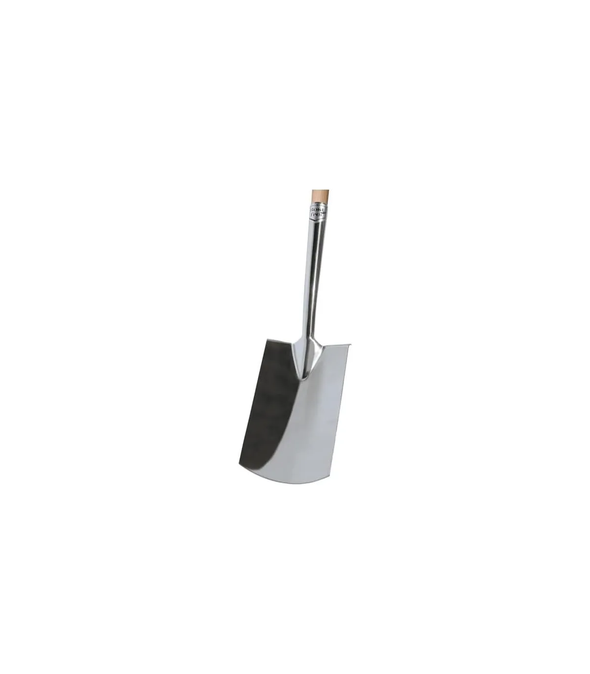 Pala estrecha cuadrada curvada en acero inoxidable, mango madera, terminación muleta.