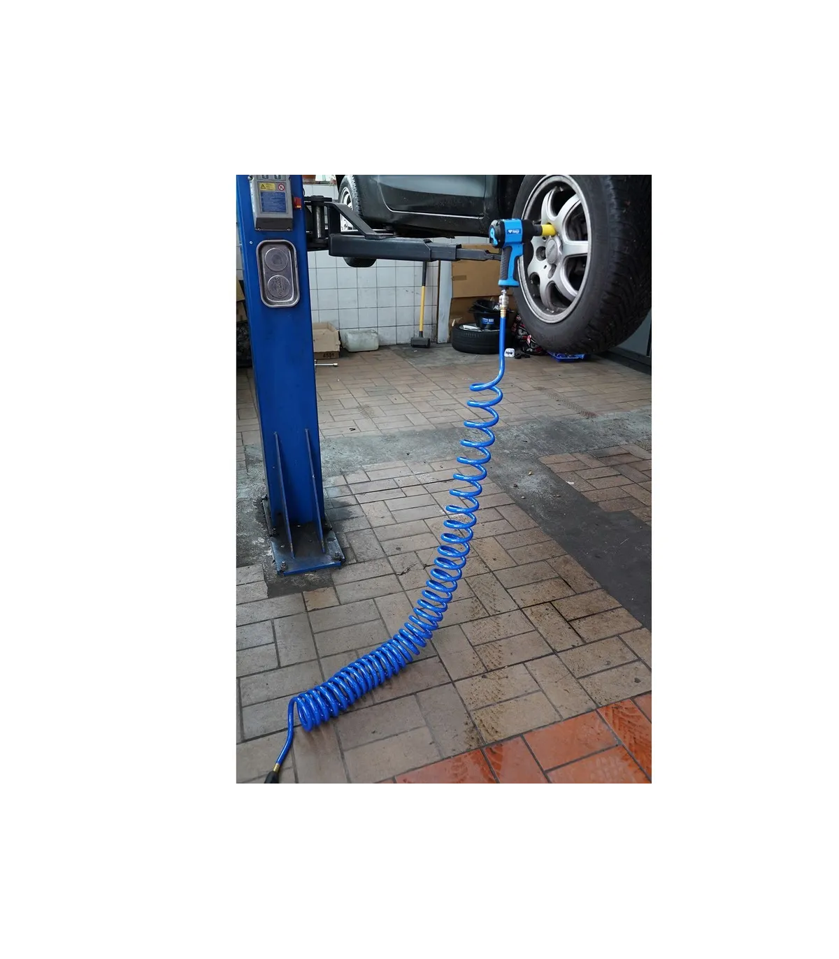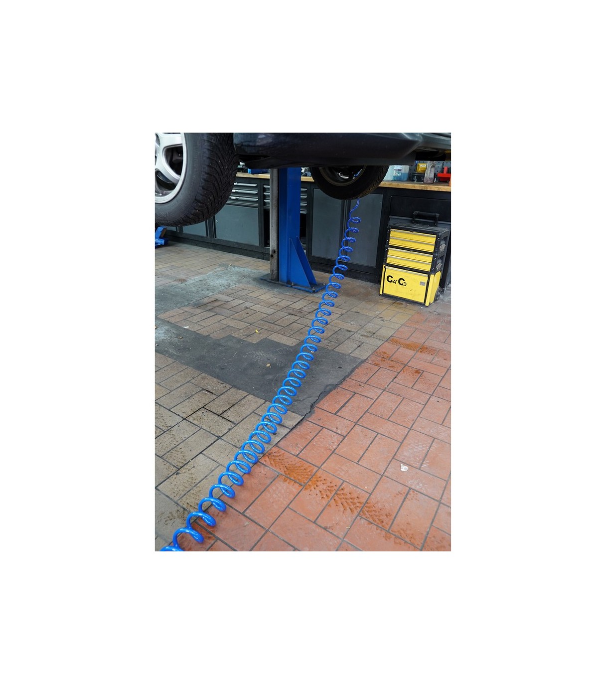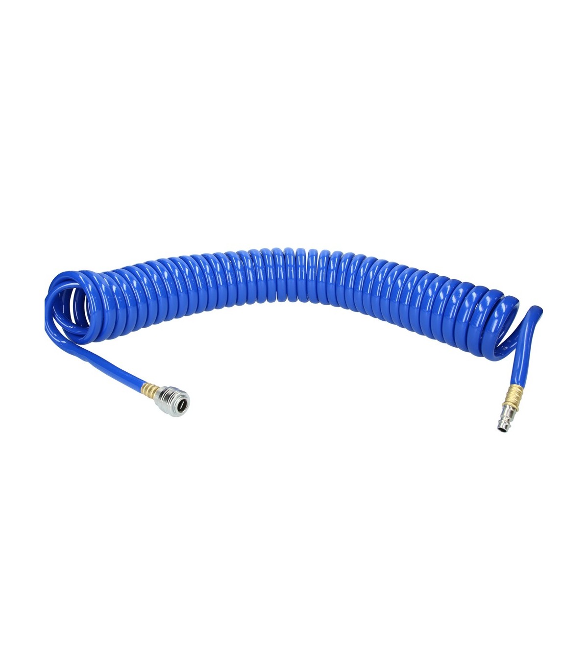 Tubo extensible para aire comprimido, con terminaciones de enchufe rápido.