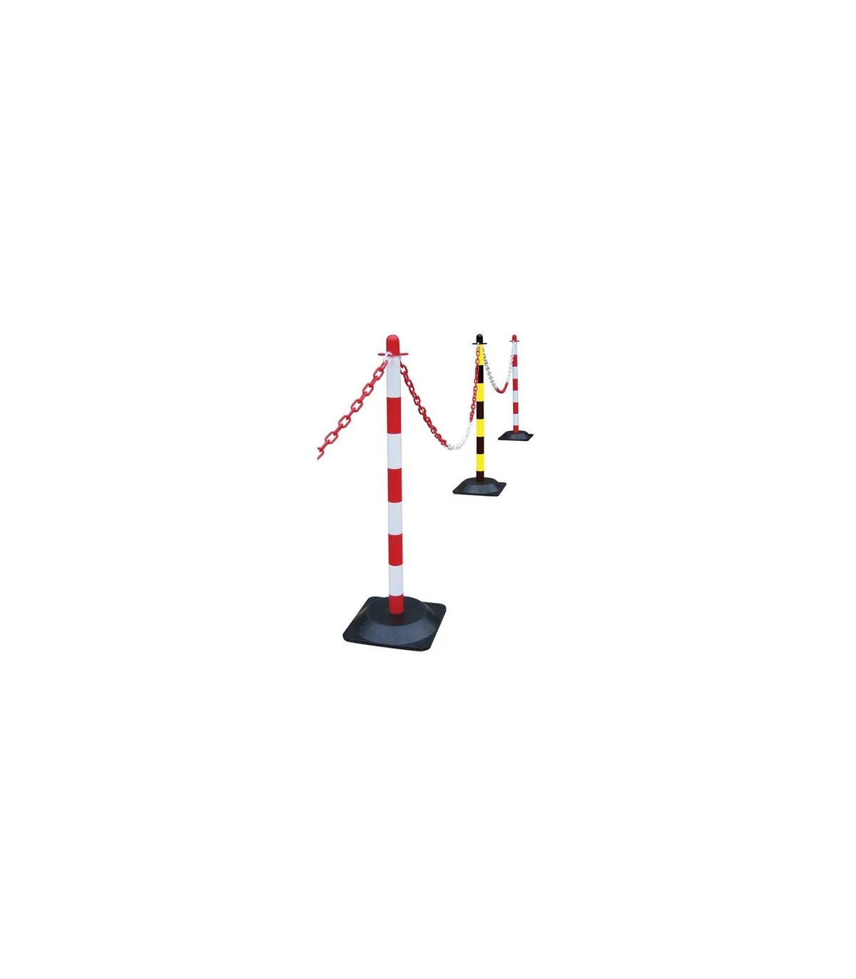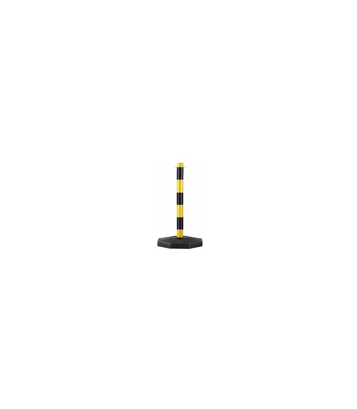 Poste señalización bicolor amarillo y blanco, con base rellenable para contrapeso, y capuchón con ojales para suspender cadenas plásticas en delimitaciones y señalizaciones perimetrales por riesgos dinámicos.