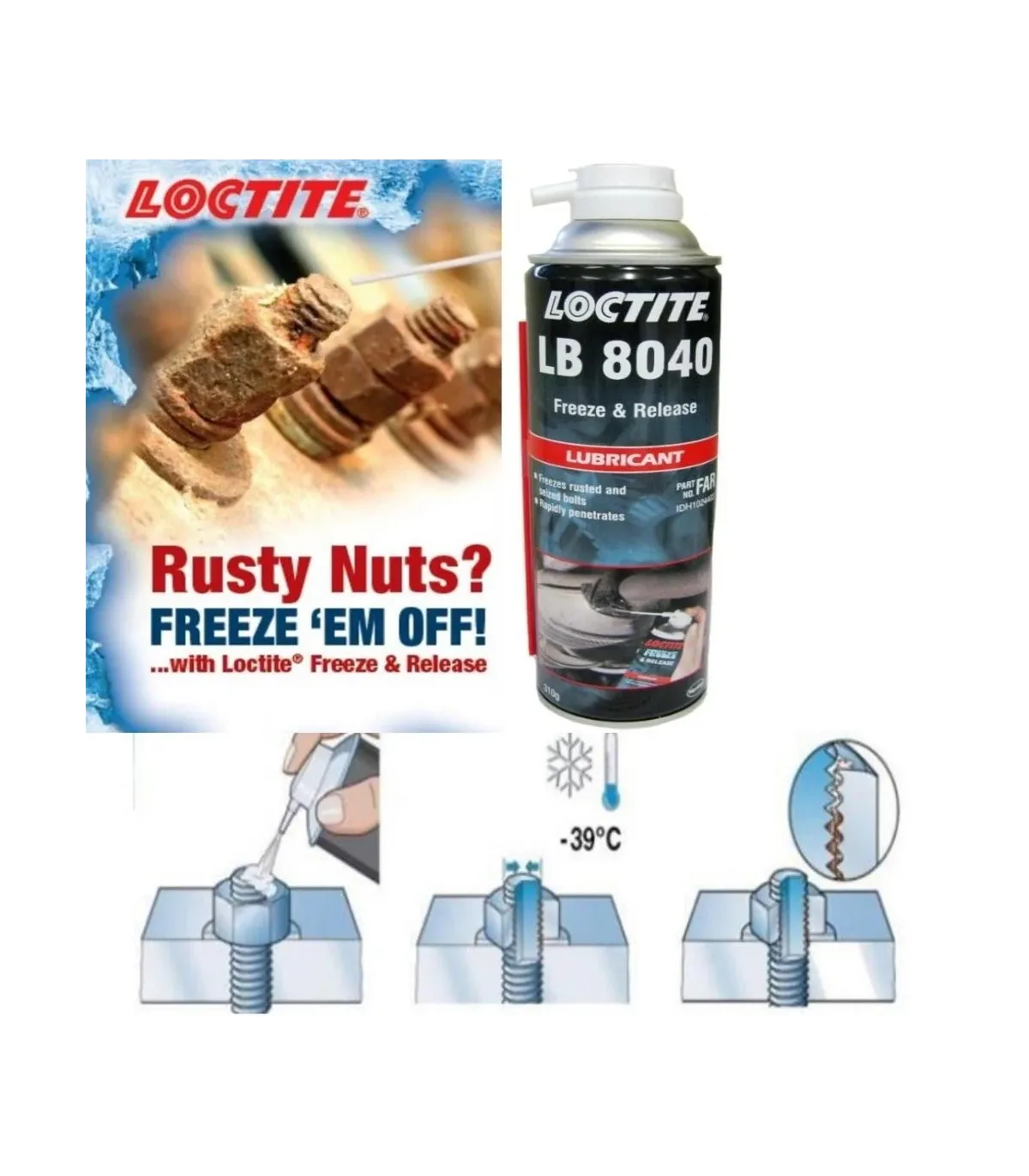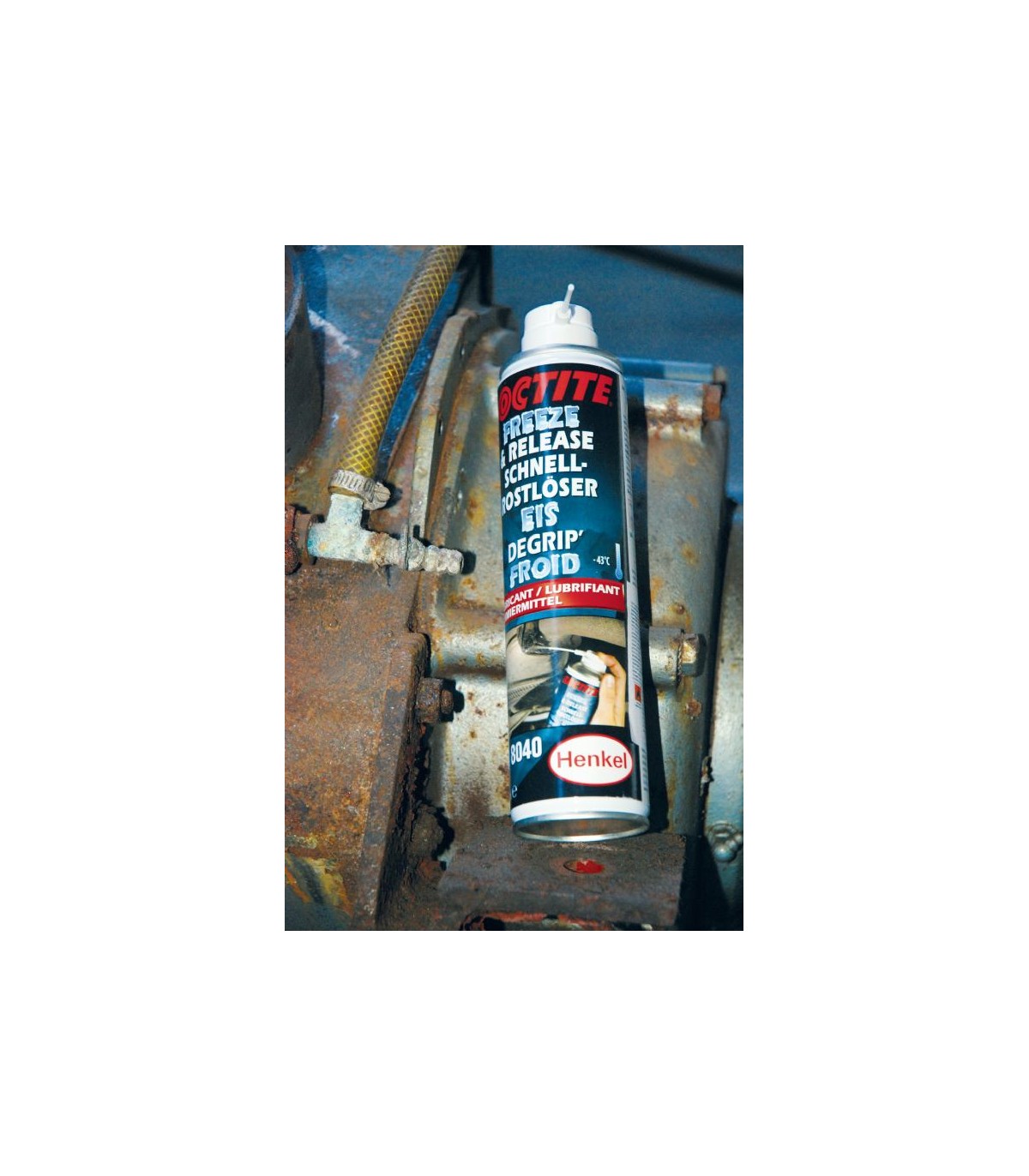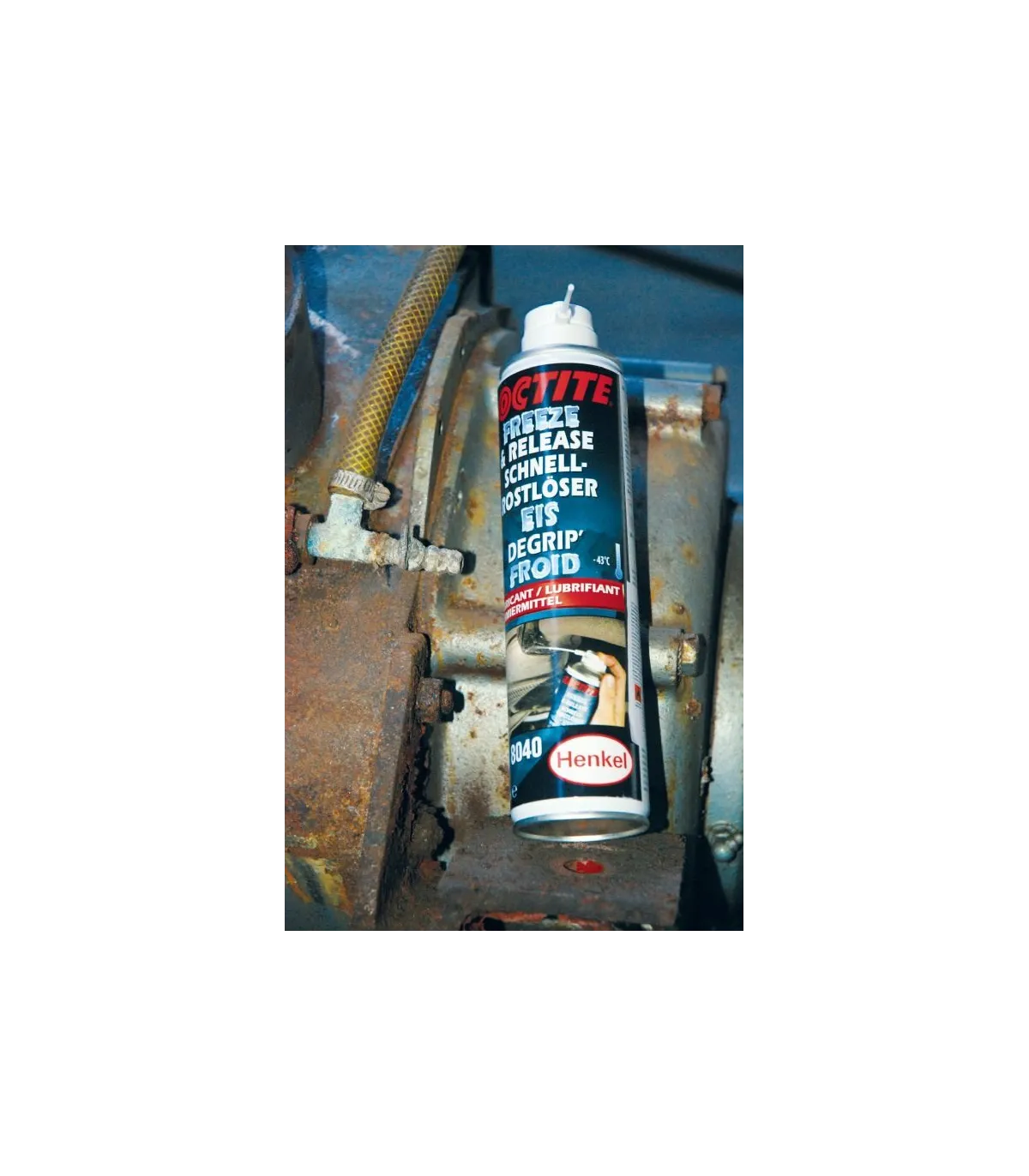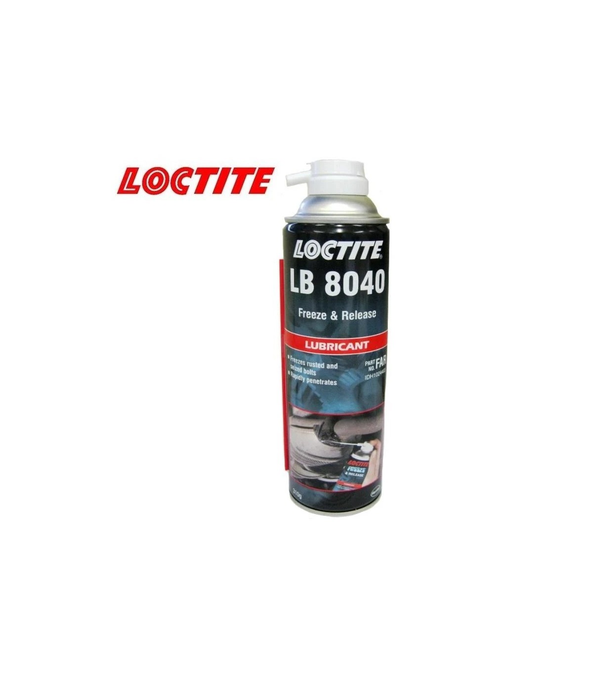 LOCTITE LB 8040 es un aceite mineral especial diseñado para liberar piezas oxidadas, corroídas y agarrotadas. El producto enfría súbitamente las piezas tratadas hasta -43 ºC y causa grietas microscópicas en la capa de óxido. Esto permite que el lubricante se filtre por capilaridad directamente hasta la capa de óxido. El producto deja sobre la pieza una fina capa que la lubrica y evita el óxido.Libera componentes oxidados, corroídos y agarrotados por medio del efecto de choque por enfriamientoUna vez sueltas, las piezas siguen estando lubricadas y protegidas contra la corrosiónSe infiltra directamente en el óxido por acción capilarLibera piezas oxidadas, corroídas y agarrotadas.Una vez sueltas, las piezas siguen estando lubricadas y protegidas contra la corrosión.