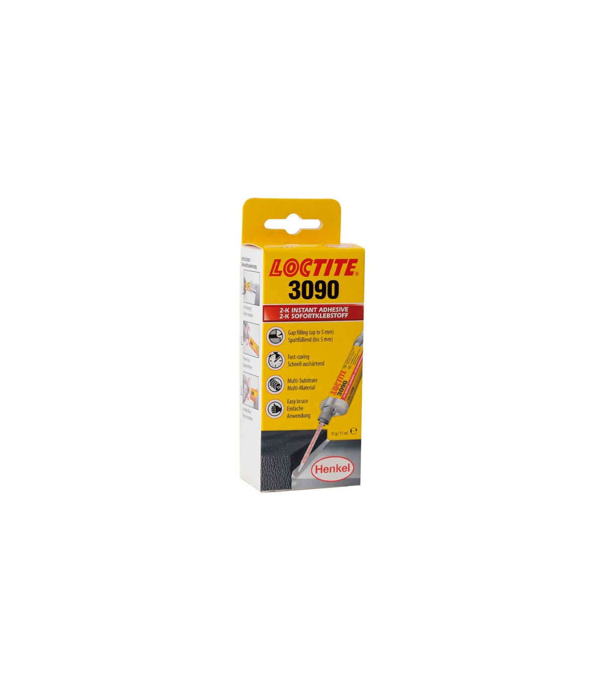 LOCTITE 3090 es un adhesivo bicomponente de curado rápido con excelentes propiedades de adhesión para una amplia variedad de sustratos, incluidos plásticos, caucho y metales. Está diseñado para el montaje de piezas con diferentes holguras, hasta 5 mm, o para aplicaciones donde es necesario el curado del exceso de adhesivo. Su formula en gel, que no gotea; permite que se pueda aplicar hasta en superficies verticales. También es adecuado para unir materiales porosos como madera, papel, cuero y tela.Curado rápidoResistencia térmica desde -40 hasta +80 °CRelleno de holguras hasta 5 mmSu consistencia en gel evita que gotee, incluso en superficies verticalesExcelentes propiedades de adhesión a los sustratos más comunes (metales, la mayoría de los plásticos, caucho, madera, papel, etc.)Aplicaciones limpias y precisas, gracias a su boquilla mezcladoraPerfecto para la adhesión rápida de piezas de plástico y todo tipo de reparaciones de emergencia