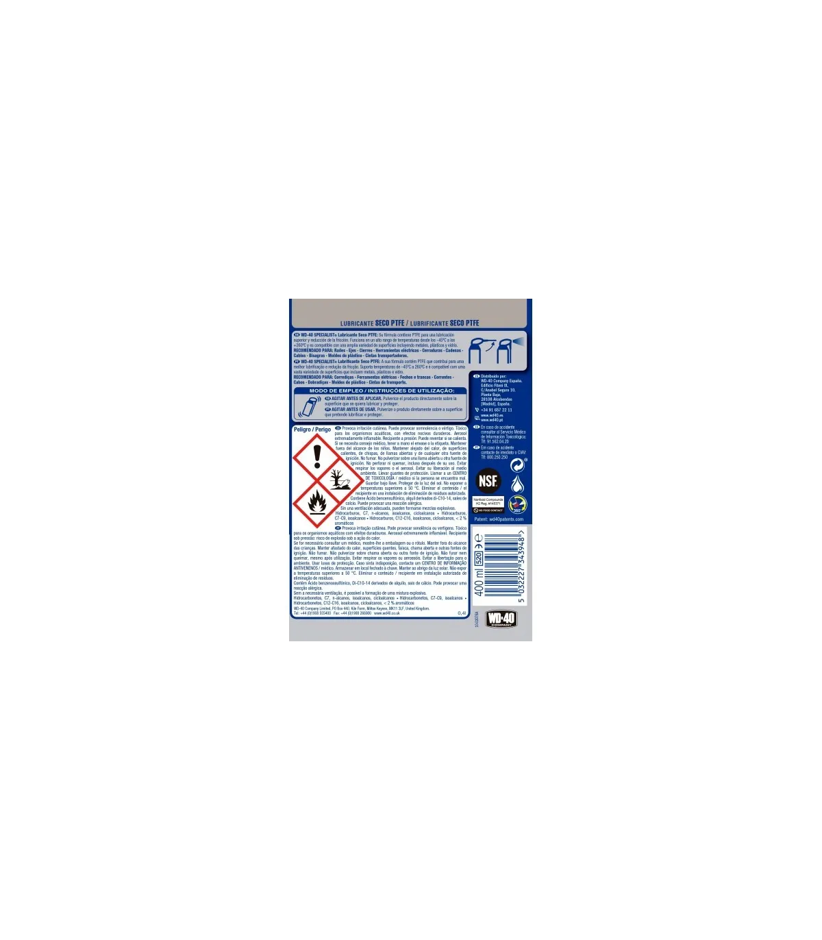 WD-40 Specialist Lubricante Seco con PTFE en formato Doble Acción de 400ml.