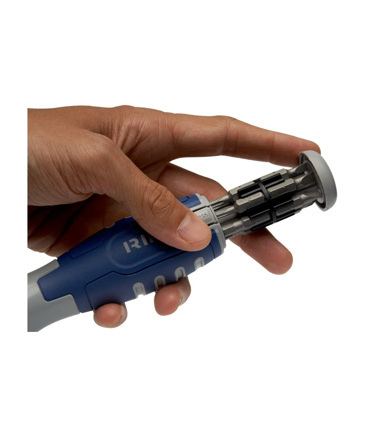 Compartimento para almacenar puntas intercambiables con botón de liberación para acceder rápidamente a ellas.