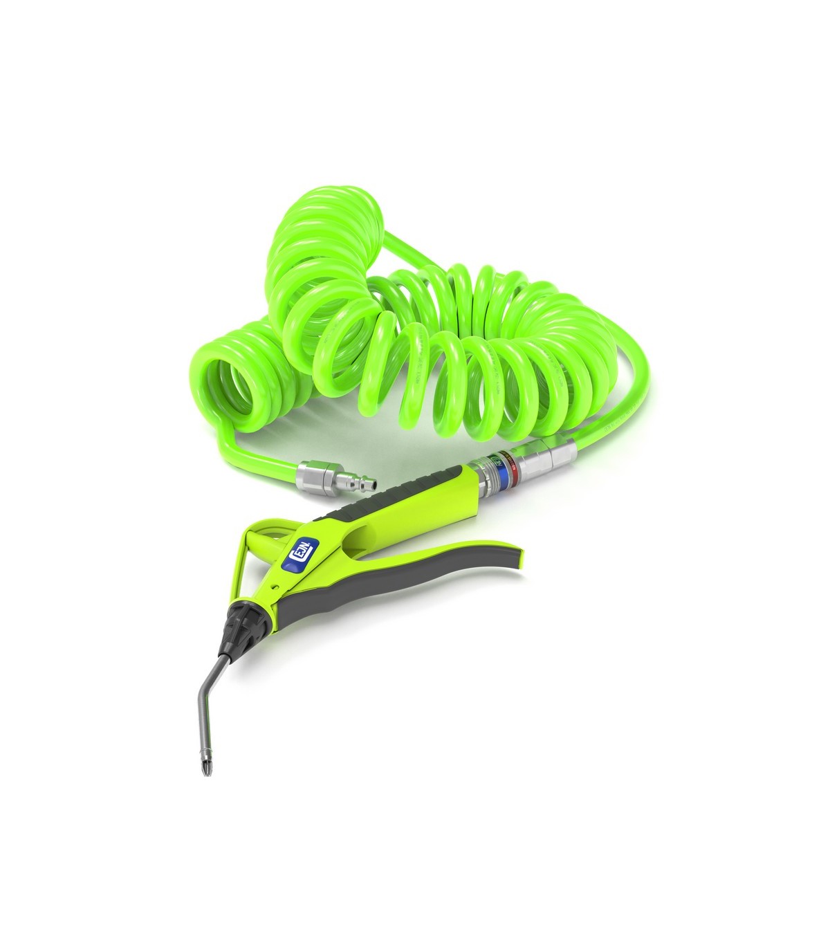 Conjunto de pistola sopladora y tubo espiral PU, Ø10mm, longitud útil 4 metros. Color VERDE Alta visibilidad