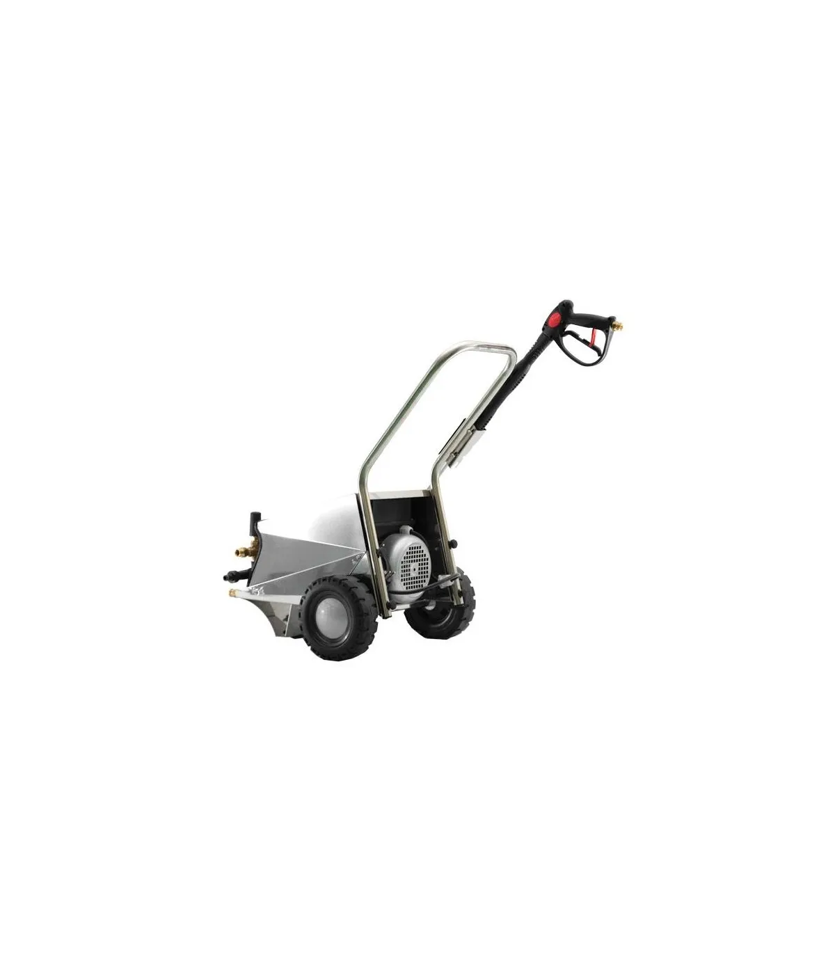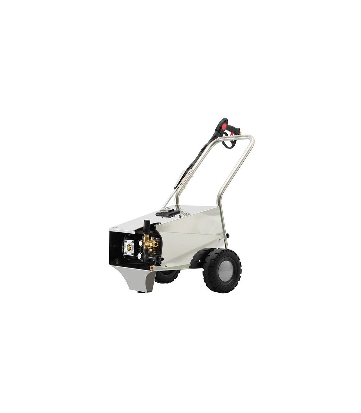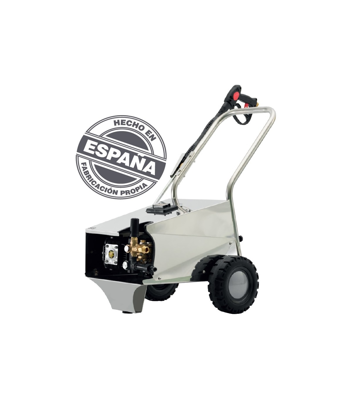Hidrolavadora industrial  fabricada en España, con chasis en inoxidable, 8m de manguera, detergente baja presión, lanza y boquillas regulables en 3