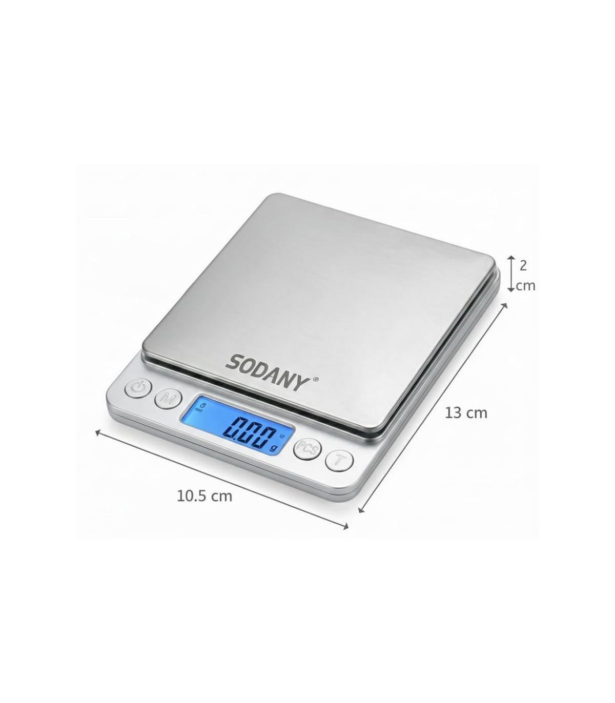 Su diseño compacto (105x130 mm) cuenta con una cubierta de plástico transparente que protege la plataforma de acero inoxidable contra el polvo y golpes. La cubierta es desmontable y se puede dar la vuelta para usarla como una bandeja de pesaje expandida para contener objetos sueltos.