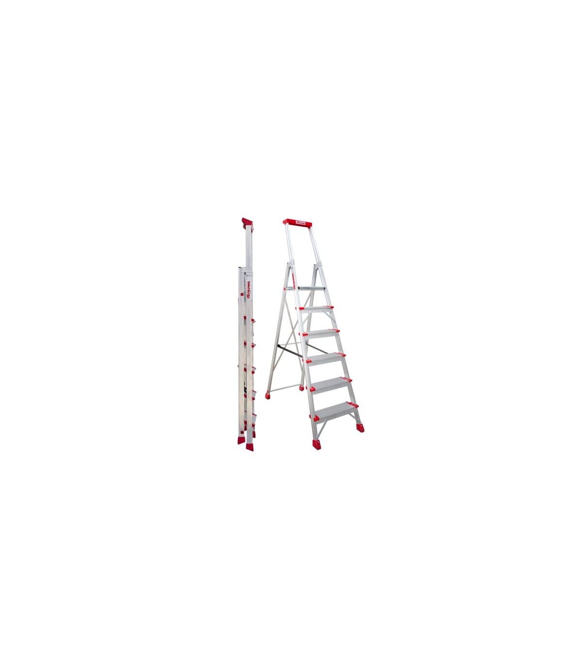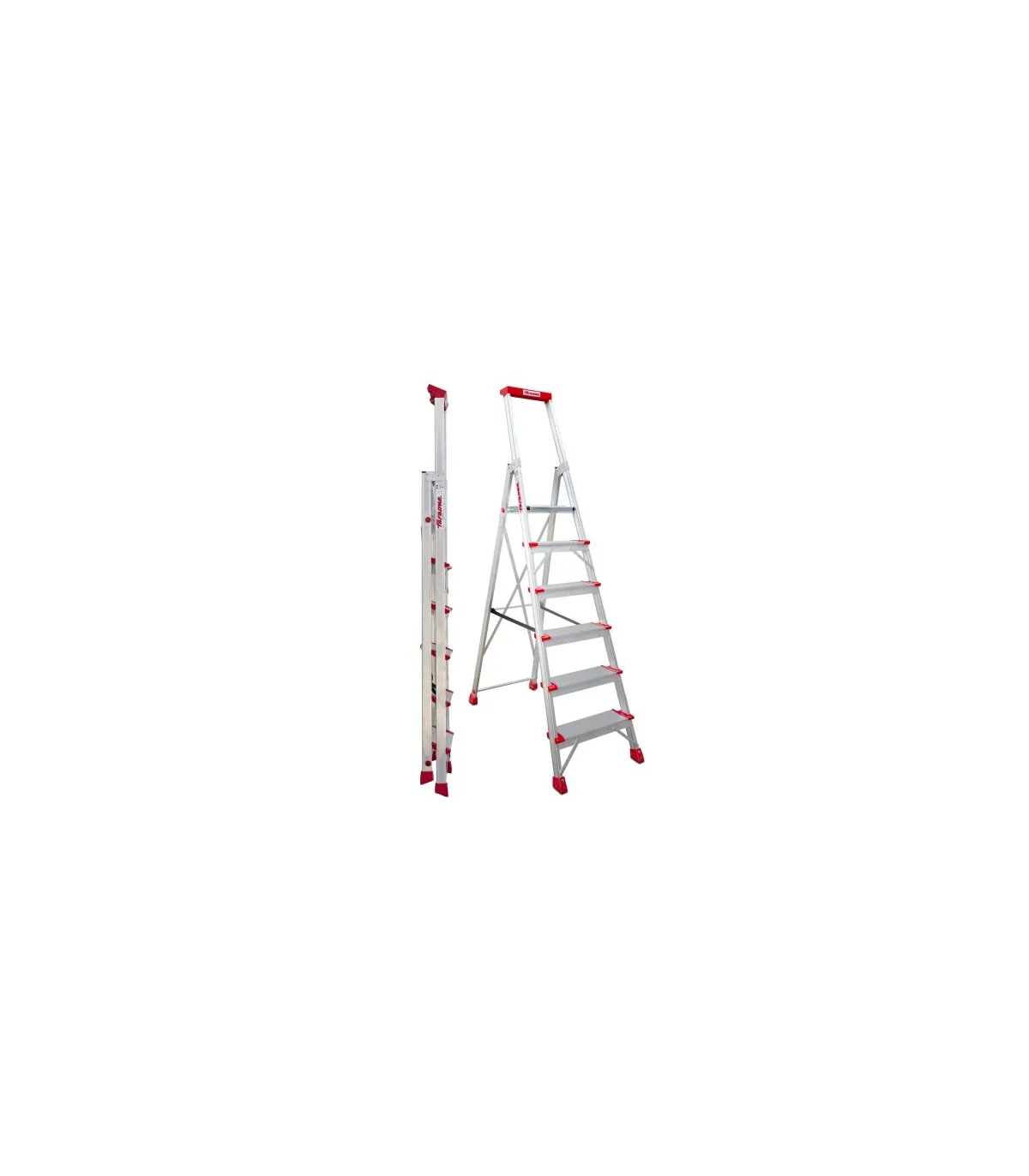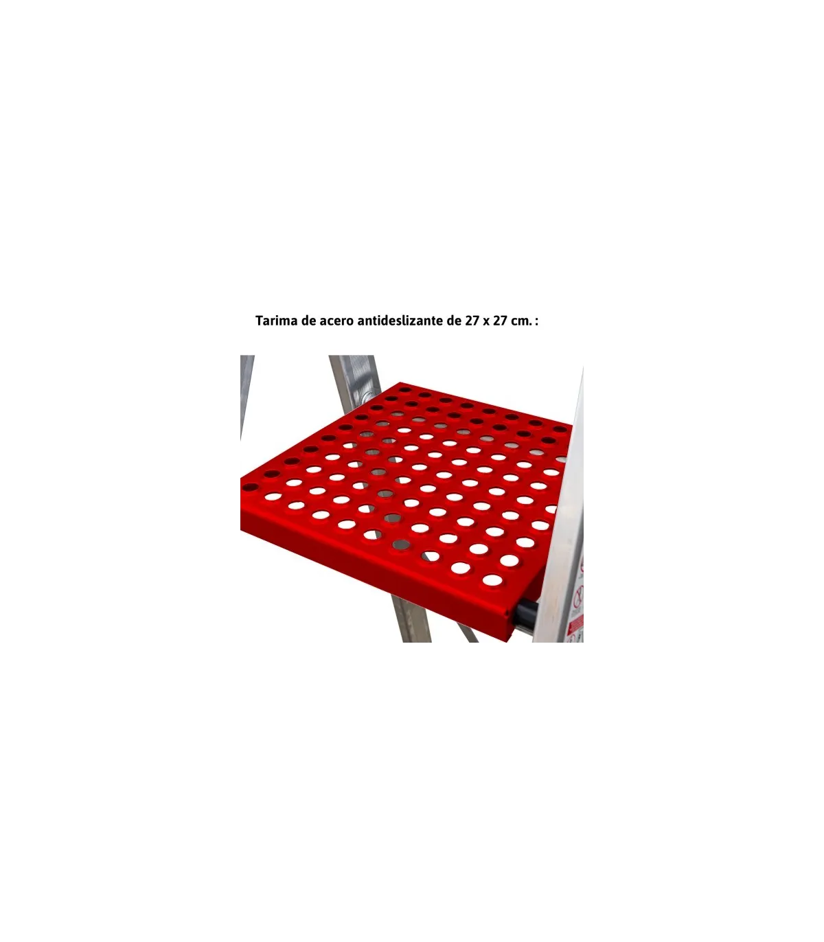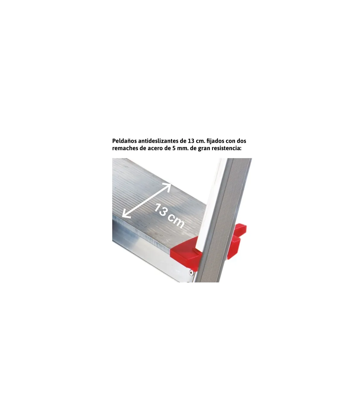 El modelo ELEGANCE está fabricado en aluminio, con montantes con perfiles estriados, peldaños de 13 cm fijados con remaches de acero de gran resistencia, posee un sistema de refuerzos en zonas vulnerables que dotan al modelo de una gran estabilidad, tarima de acero antideslizante de 27x27 cm. y una amplia bandeja portaobjetos.
