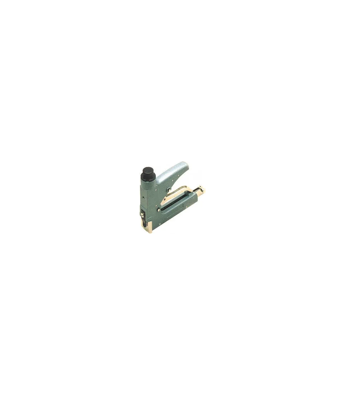 Se trata de una grapadora manual metálica con una nariz saliente para facilitar el trabajo en lugares de dificil acceso.