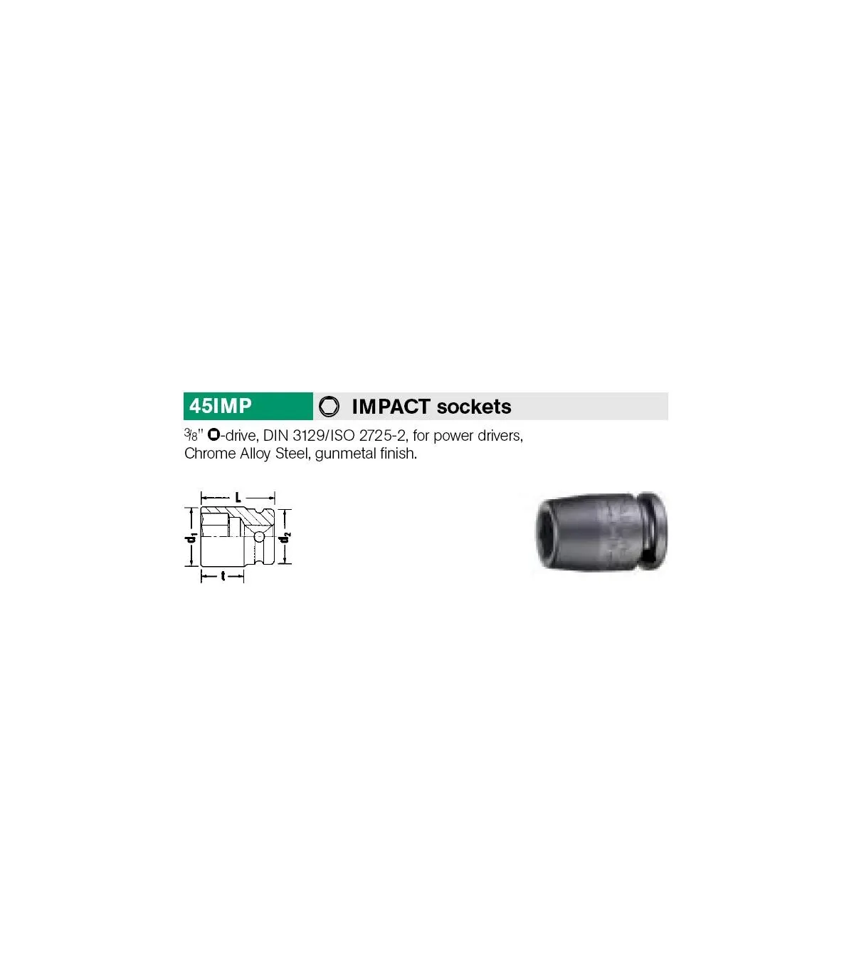 Llave de vaso de impacto de cuadrado 1/2" (12.5mm) y boca hexagonal de 15 mm. Fosfatada. Version corta, largo total 38mm (aprox)
