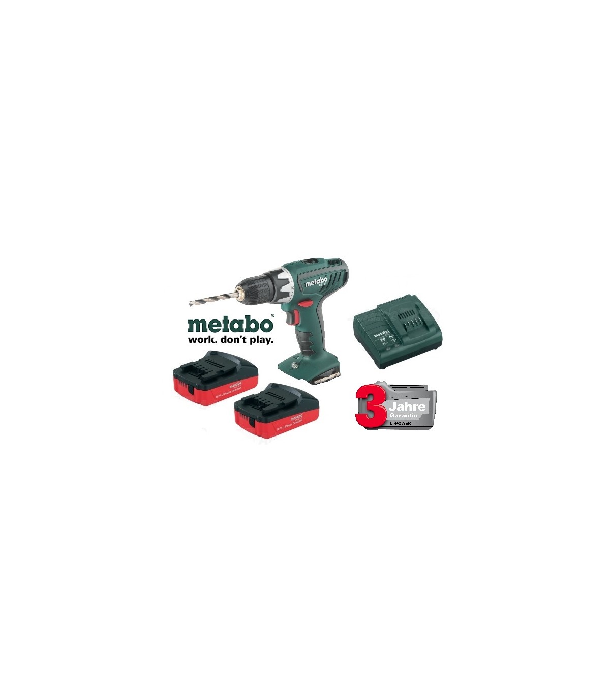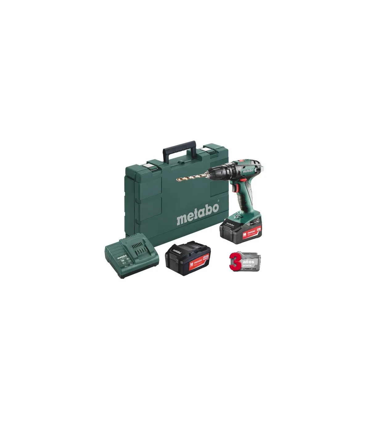 Taladro básico de servicio ligero Metabo 18 voltios con 2 baterias, cargador y maleta.