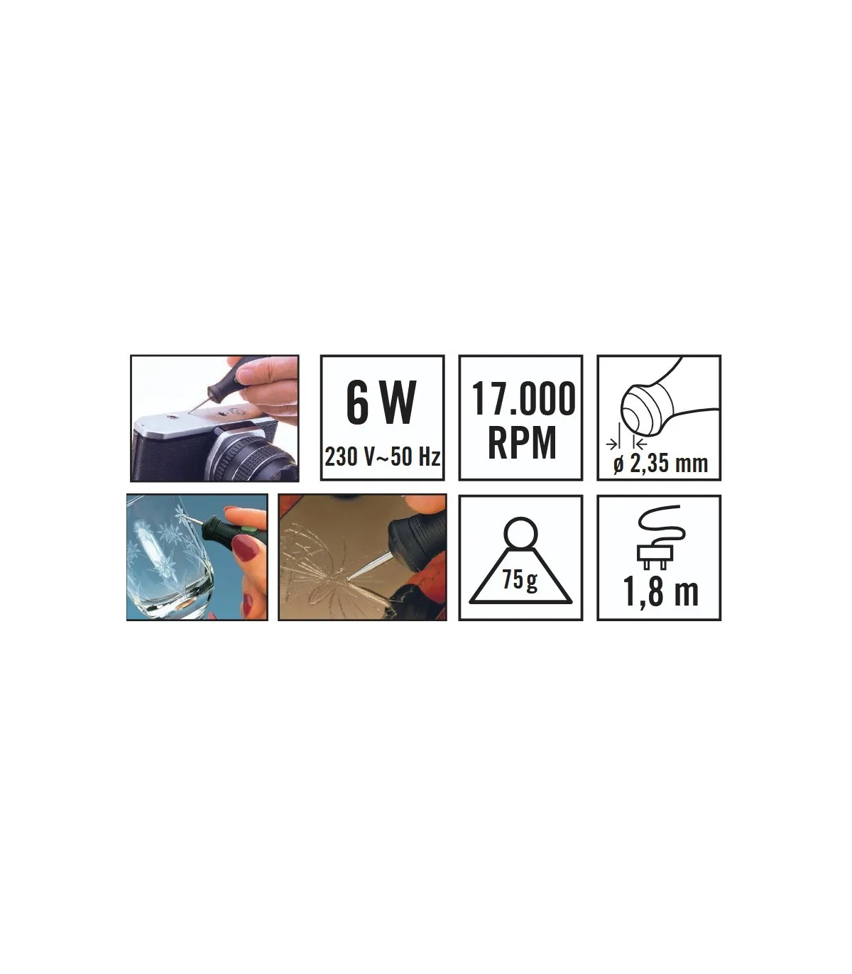 Pot.max 6W. Velocidad 17.000rpm. Portabrocas Ø2.35mm. Cable 1,8m. Peso