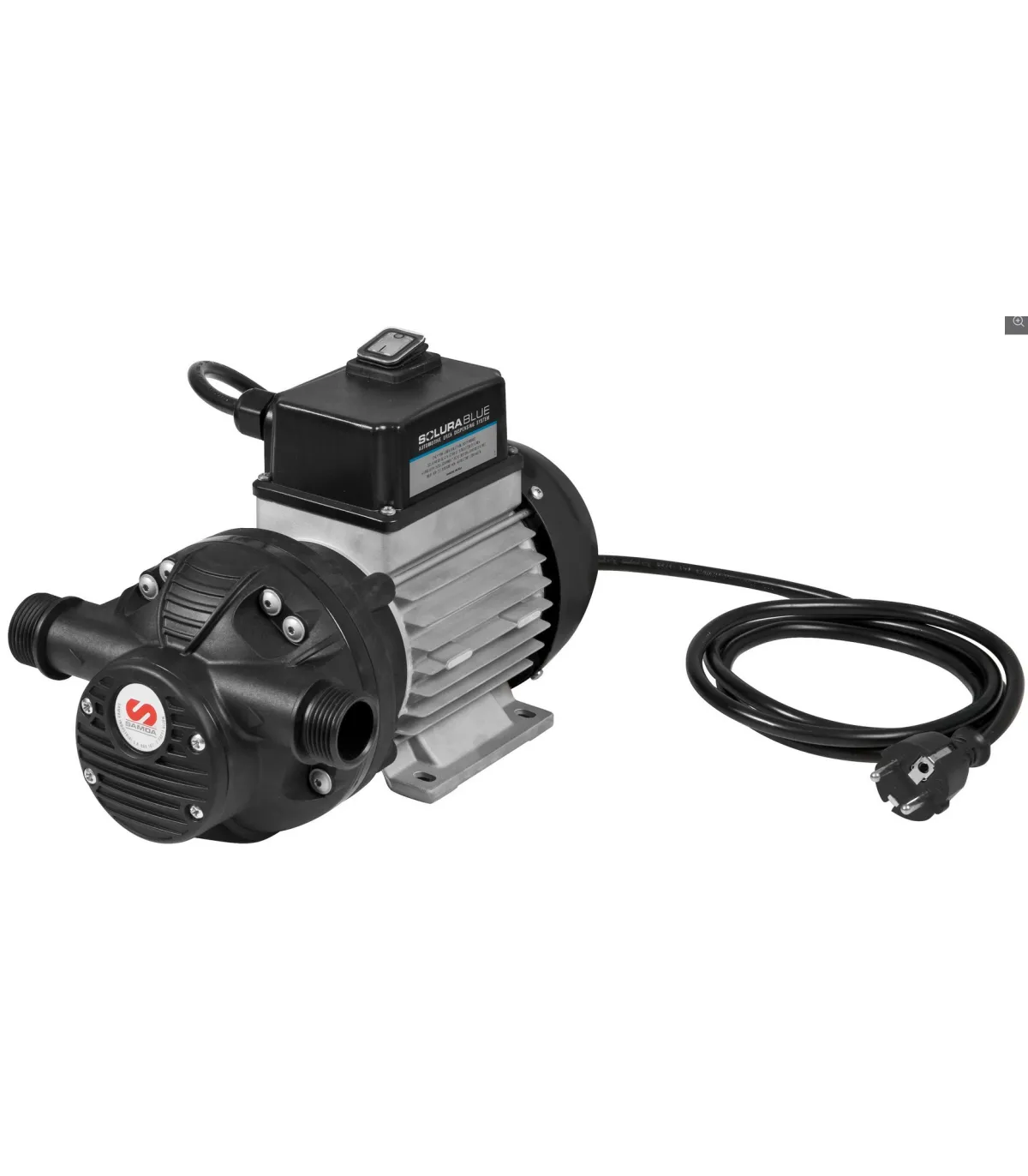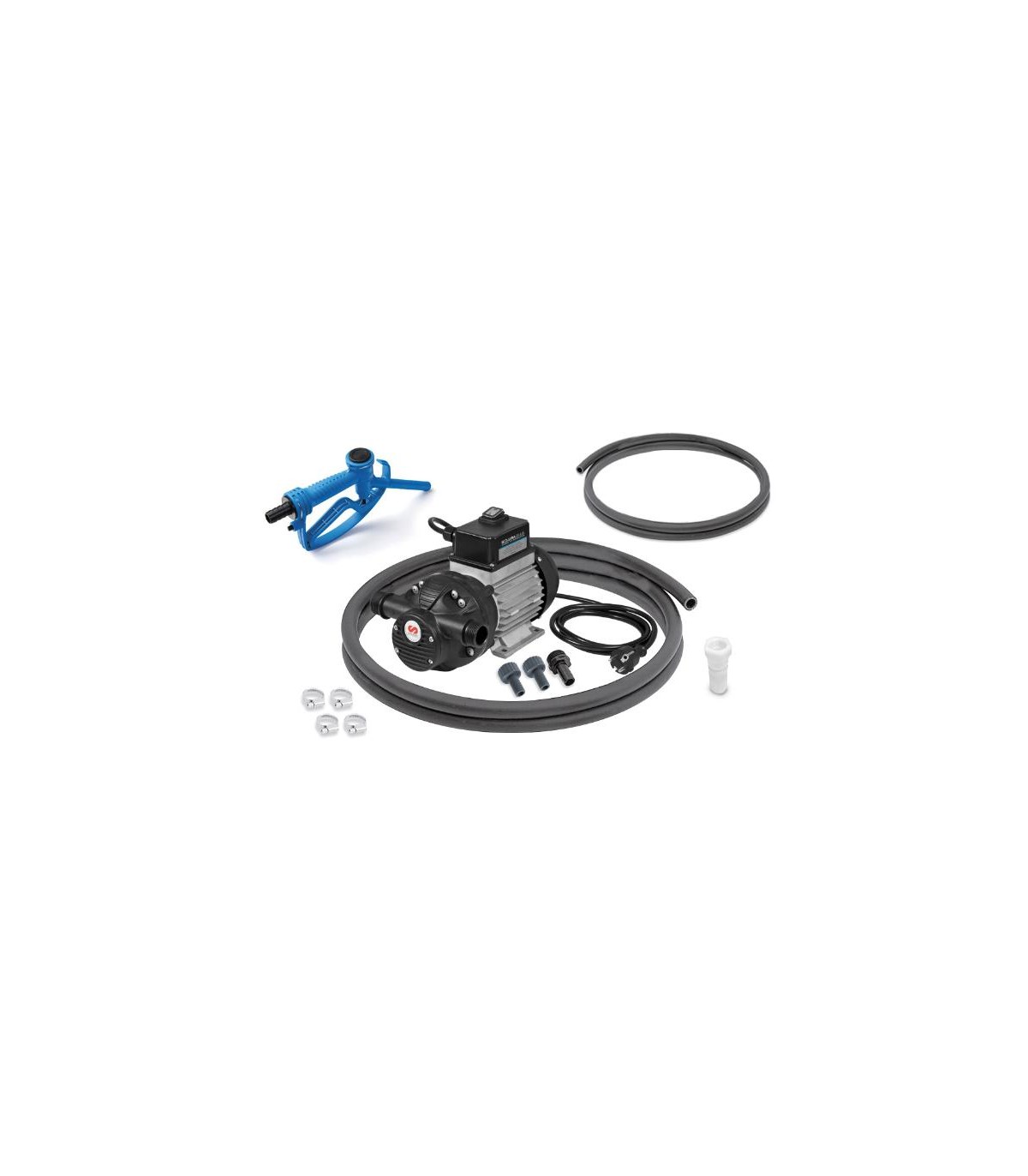 Kits de suministro portátiles para Urea / Adblue con bombas de corriente alterna 230 V AC serie Solura, incluye accesorios de conexión y suministro según configuración. Versión con bomba 30 l/min, boquerel standard, kit de succión y mangueras de servicio aspiración y salida -3 y 4 metros de longitud, respectivamente-.