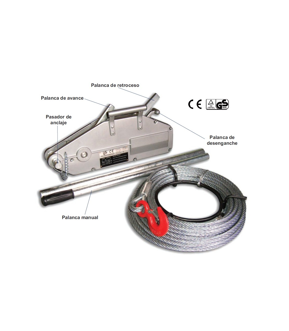 Provisto de palanca para desenganchar las  mordazas, permitiendo una fácil y suave instalación del cable - Palancas independientes de avance y retroceso - No apto para elevación o traslación de personas (ej.: andamios, etc...).