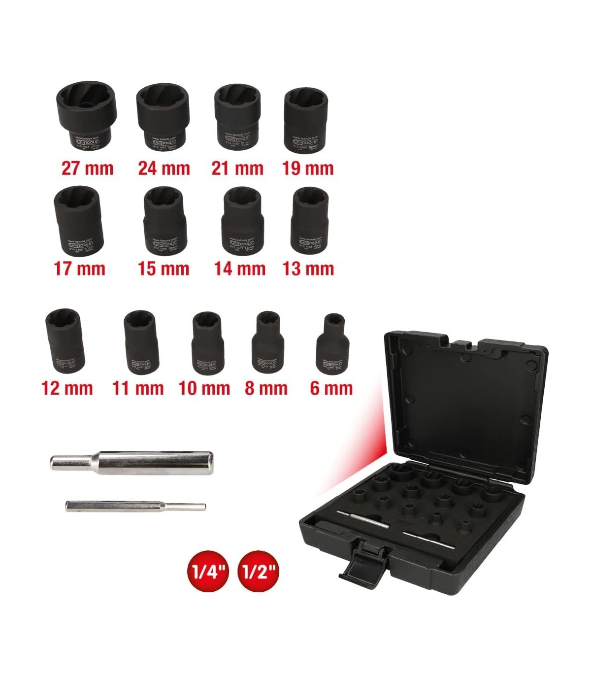 Con vasos de 3/8" y Ø8, 10, 11, 12, 13, 14, 16, 17, 18, 19mm y de 1/2" en Ø21,  22, 24 y 27mm.