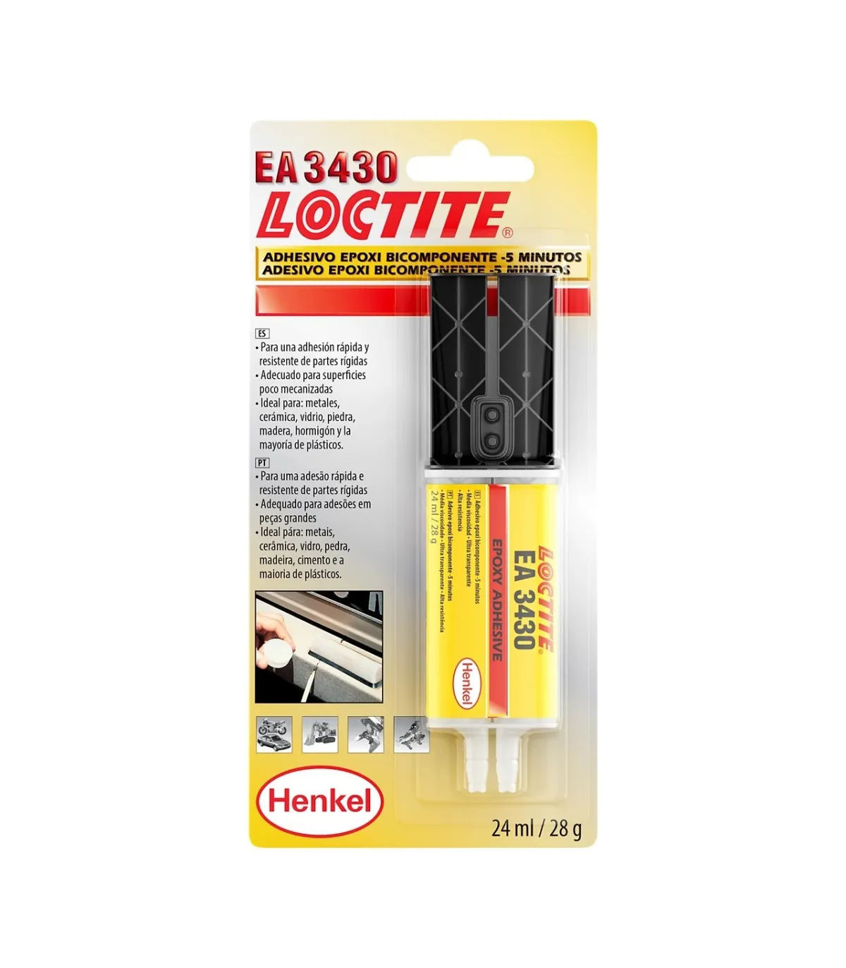 LOCTITE EA 3430 es un adhesivo epoxi bicomponente con gran capacidad de relleno de holguras. El producto pega una gran variedad de materiales es impermeable y resistente a impactos. Es ideal para la reparación de plásticos duros como p. ej. grapas y soportes de parachoques y guardabarros. Especialmente indicado para todo tipo de aplicaciones en las que haya que unir piezas entre las que existen grandes holguras. Su viscosidad media y su fijación rápida a temperatura ambiente aseguran una aplicación fácil.Línea de unión ultra claraFácil y rápido de aplicar a temperatura ambienteResistente al aguaAdhesivo de uso general. Adecuado para una gran variedad de sustratos
