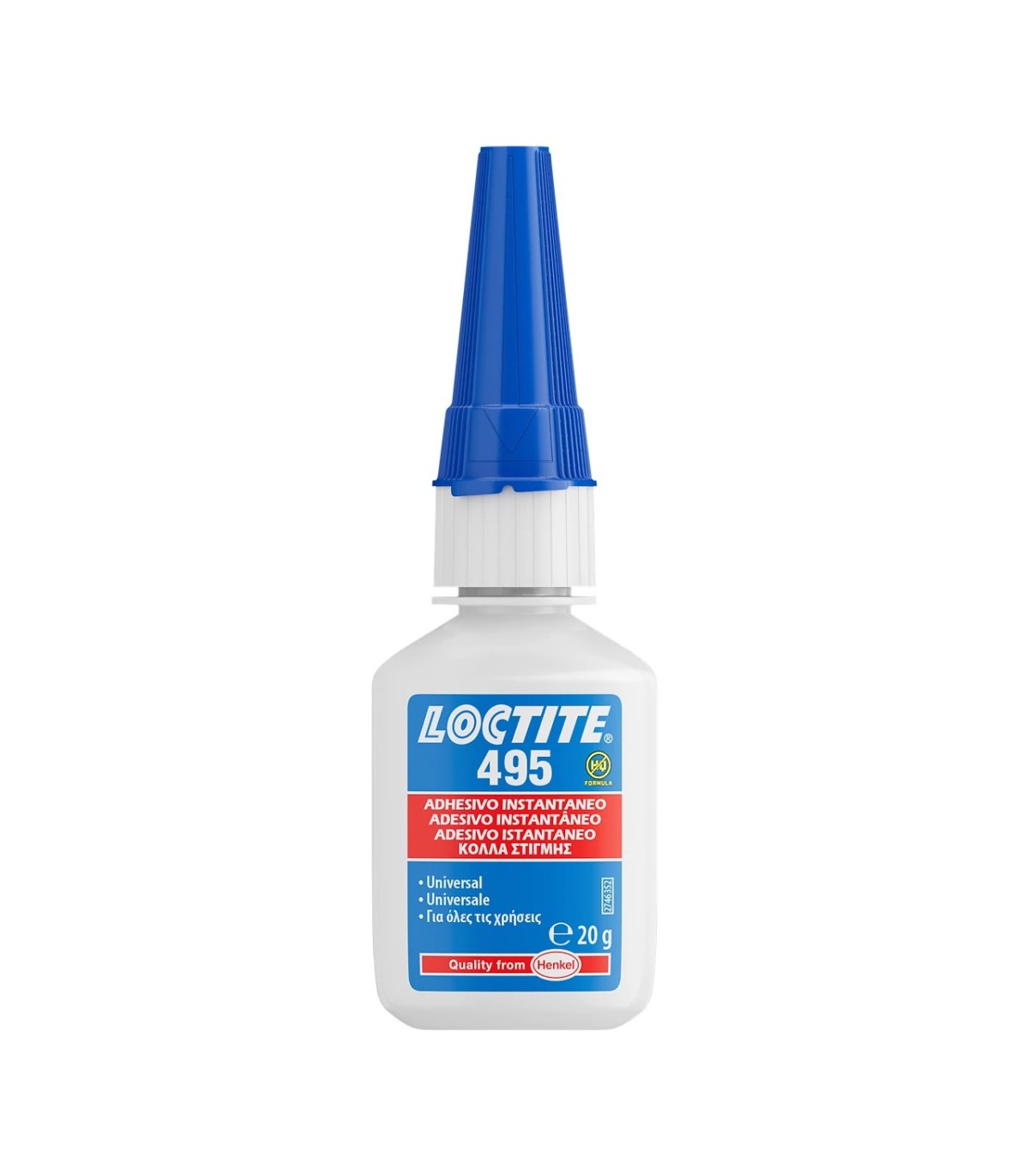 LOCTITE 495 es un adhesivo instantáneo transparente, incoloro, de baja viscosidad, en base etilo de curado rápido (tiempo de fijación de 5 a 20 segundos). Es capaz de unir una amplia gama de materiales, incluyendo plásticos, cauchos y metales. También adhiere poliolefinas en combinación con la imprimación LOCTITE SF 770 o LOCTITE SF 7239. Está disponible en envases de 20 g, 50 g, y 500 g.Uso generalBaja viscosidad10 a 20 segundos tiempo de fijaciónIncoloro y transparente