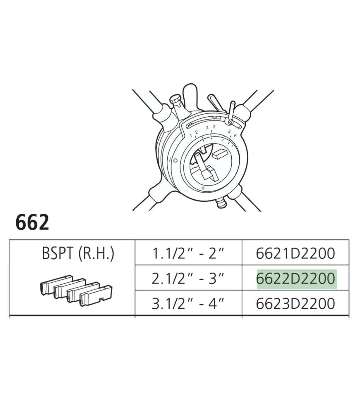 Juego de 4 piezas de peines para cabezal/ terraja roscadora tipo 662, de 2.1/2" a 3" BSPT-D
