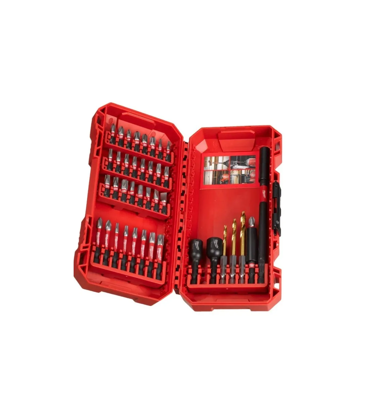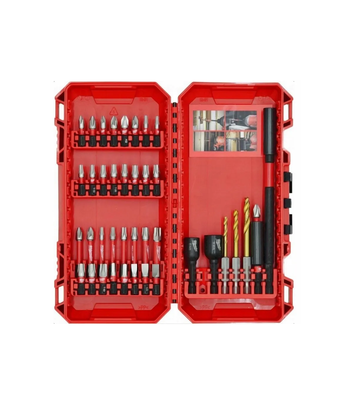 Práctico y compacto estuche reforzado con puntas, adaptadores y brocas básicos Milwakee pero Heavy Duty, aptos inlcuso para atornilladores de impacto. Composición: