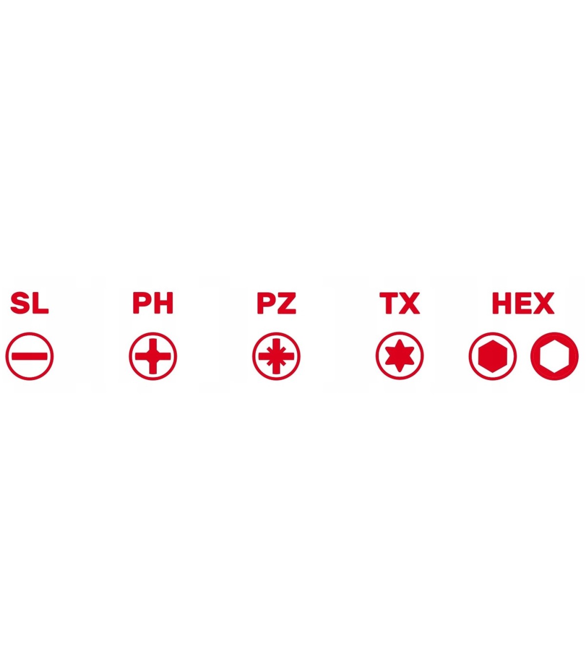 8 x 50mm: 1 x PH2, 1 x PZ2, 1 x TX10 / 1 x TX15 / 1 x TX20 / 1 x TX25 / 1 x TX30 / 1 x TX40.