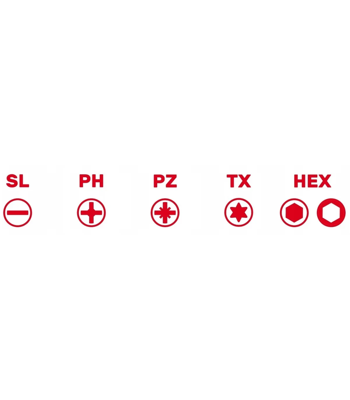 25x 25mm: 1 x PH1 / 2 x PH2, 1 x PZ1 / 3 x PZ2, 2 x TX10 / 2 x TX15 / 3 x TX20 / 3 x TX25 / 2 x