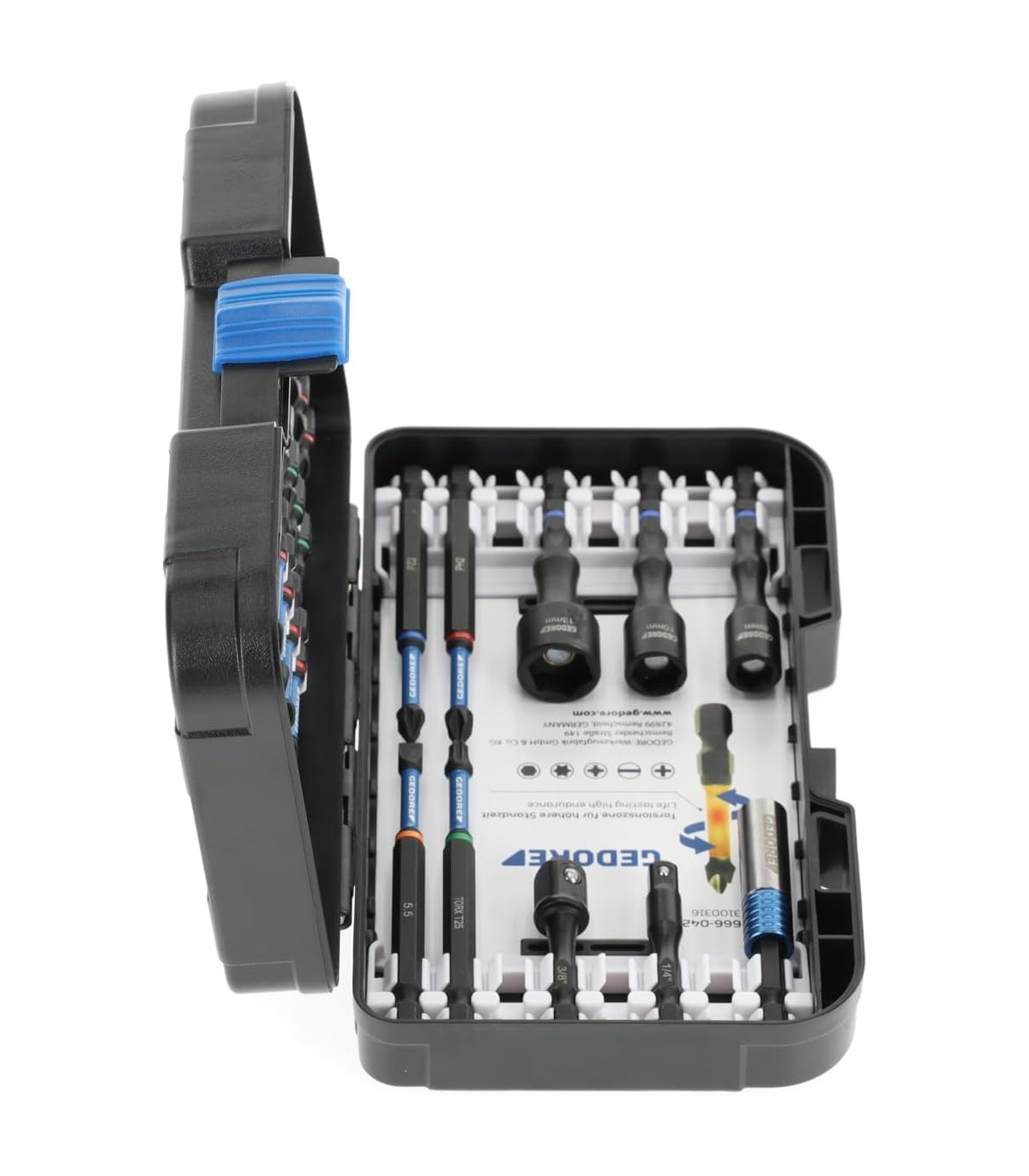 Completo juego de puntas de atornillar y accesorios de impacto para uso manual o con máquina de atornillado. Marca Gedore, Germany.