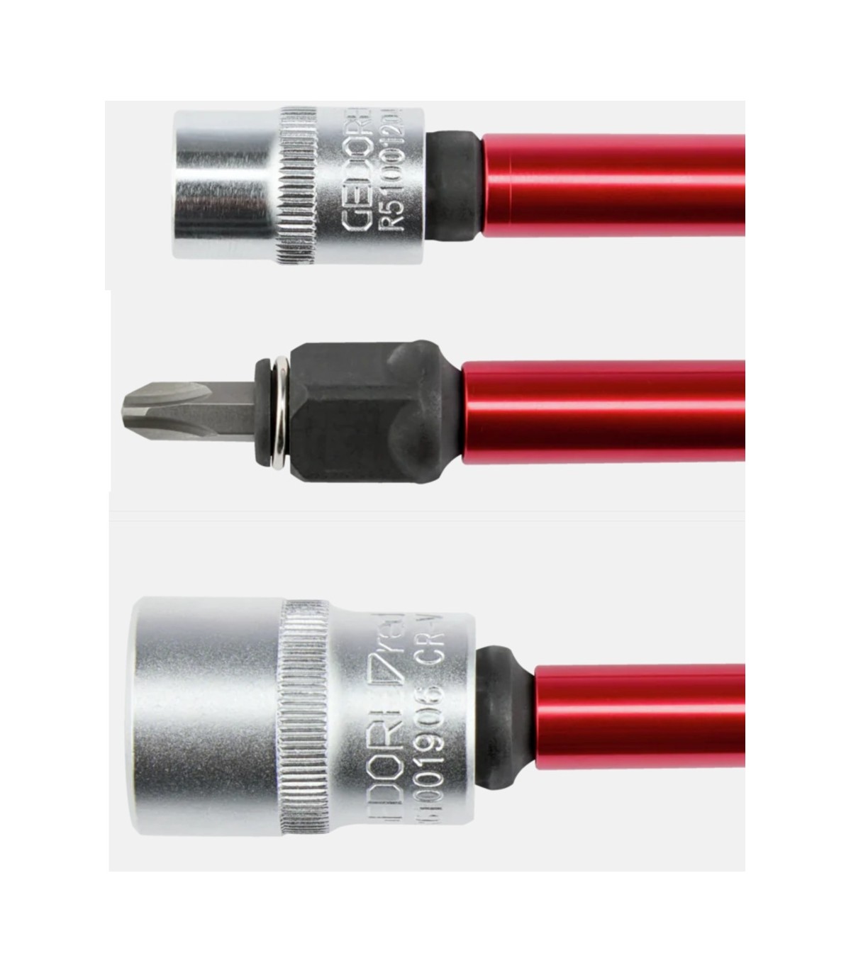 Equipados con mangas de giro rápido para rotación manual eficiente, son compatibles con puntas de 1/4” (6,3 mm) y llaves de vaso de 3/8” y 1/2”, asegurando versatilidad en el taller.