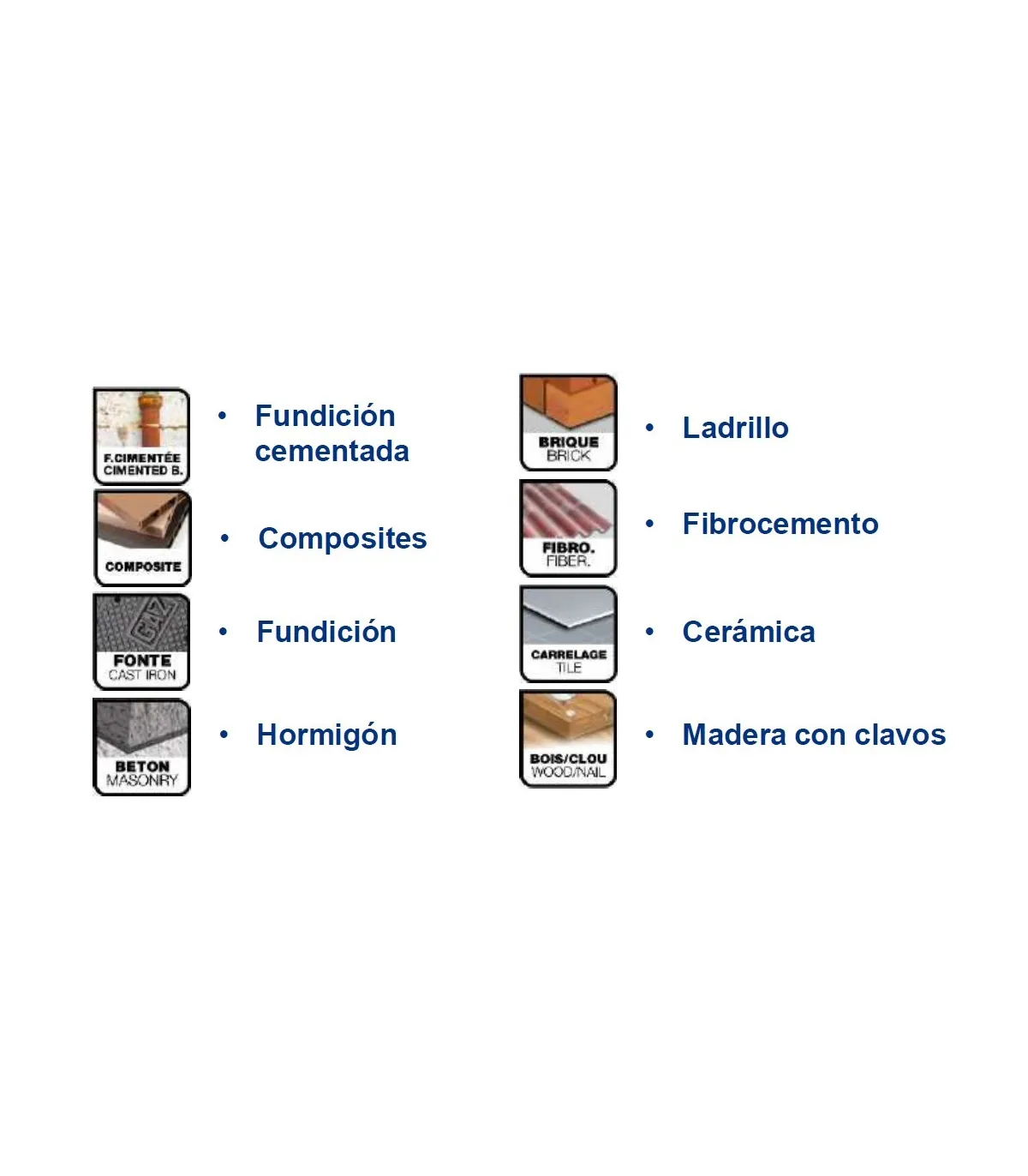La hoja diamantada permite cortar una amplia gama de materiales difíciles: hormigón armado, cerámica, piedra natural, ladrillo refractario, fundición e incluso materiales compuestos