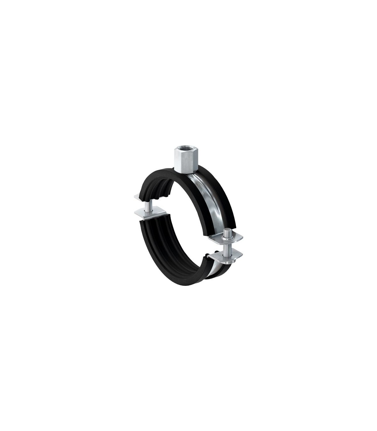Abrazadera isofónica reforzada, diseñada para fijar tubos de ventilación, plásticos o metálicos de entre Ø18 y Ø355 mm (según el modelo). Se puede emplear en instalaciones de suministro o evacuación de agua o de transporte de gasóleo, entre otras. Cuenta con una tuerca soldada de doble rosca M8-M10 y una goma aislante de EPDM que reduce el ruido y las vibraciones. Cumple el Código Técnico de la Edificación y la norma DIN-4109 de aislamiento al ruido. Está fabricada en acero zincado.